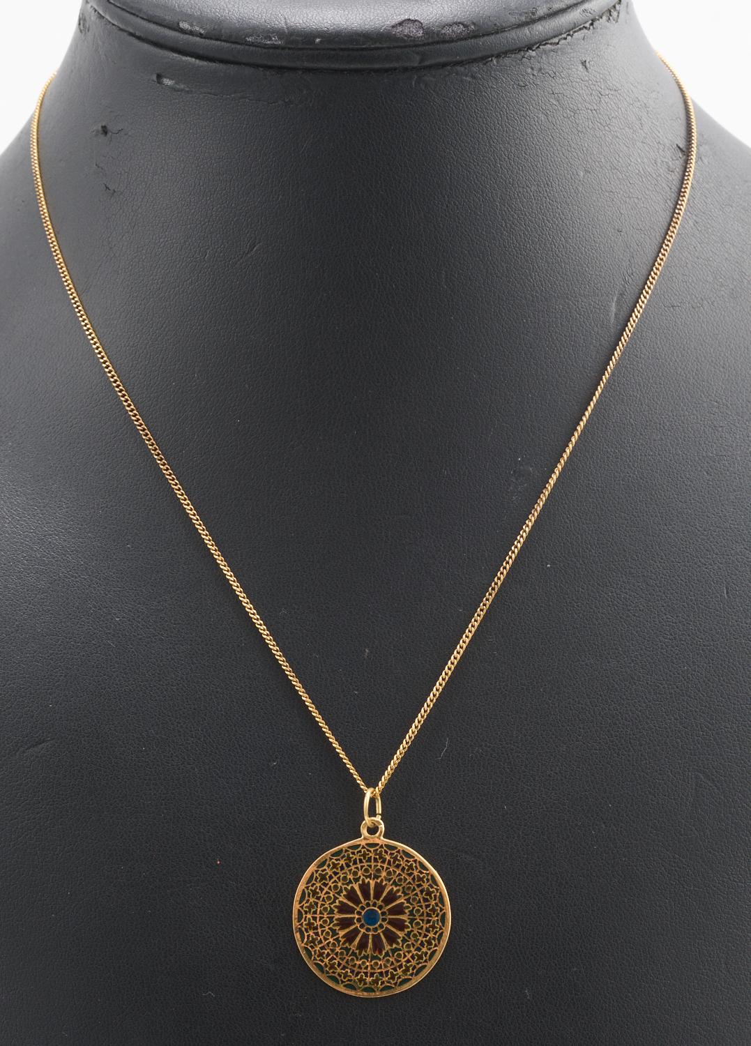 A FRENCH PLIQUE-A-JOUR PENDANT TO A FINE TRACE CHAIN IN 9CT GOLD, LENGTH 44CM, TOTAL WEIGHT 5.5GMS
