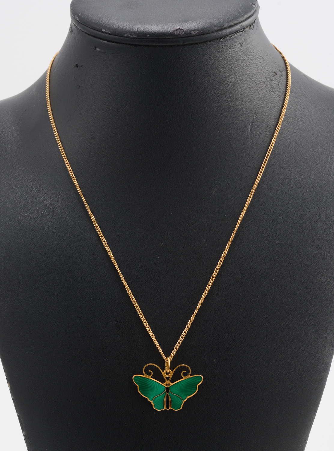 AN ENAMEL BUTTERFLY PENDANT BY DAVID ANDERSON IN GOLD PLATED STERLING SILVER TO A GOLD CHAIN IN 12CT, LENGTH 50CM