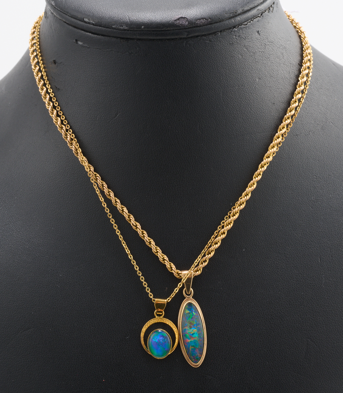 AN OPAL TRIPLET PENDANT IN 9CT GOLD, TO A GOLD PLATED ROPE TWIST CHAIN, TOGETHER WITH A GOLD PLATED OPAL TRIPLET PENDANT AND CHAIN, BOTH LENGTHS APPROXIMATELY 36CM