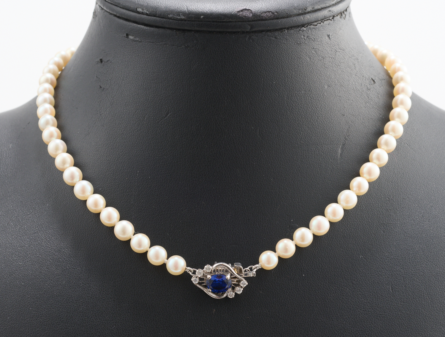 A 14CT WHITE GOLD GEM SET AND PEARL NECKLACE, THE PEARLS MEASURING APPROXIMATELY 6.30MM, TO AN OPENWORK WHITE GOLD AND GEM SET CLASP, LENGTH APPOXIMATELY 425MM