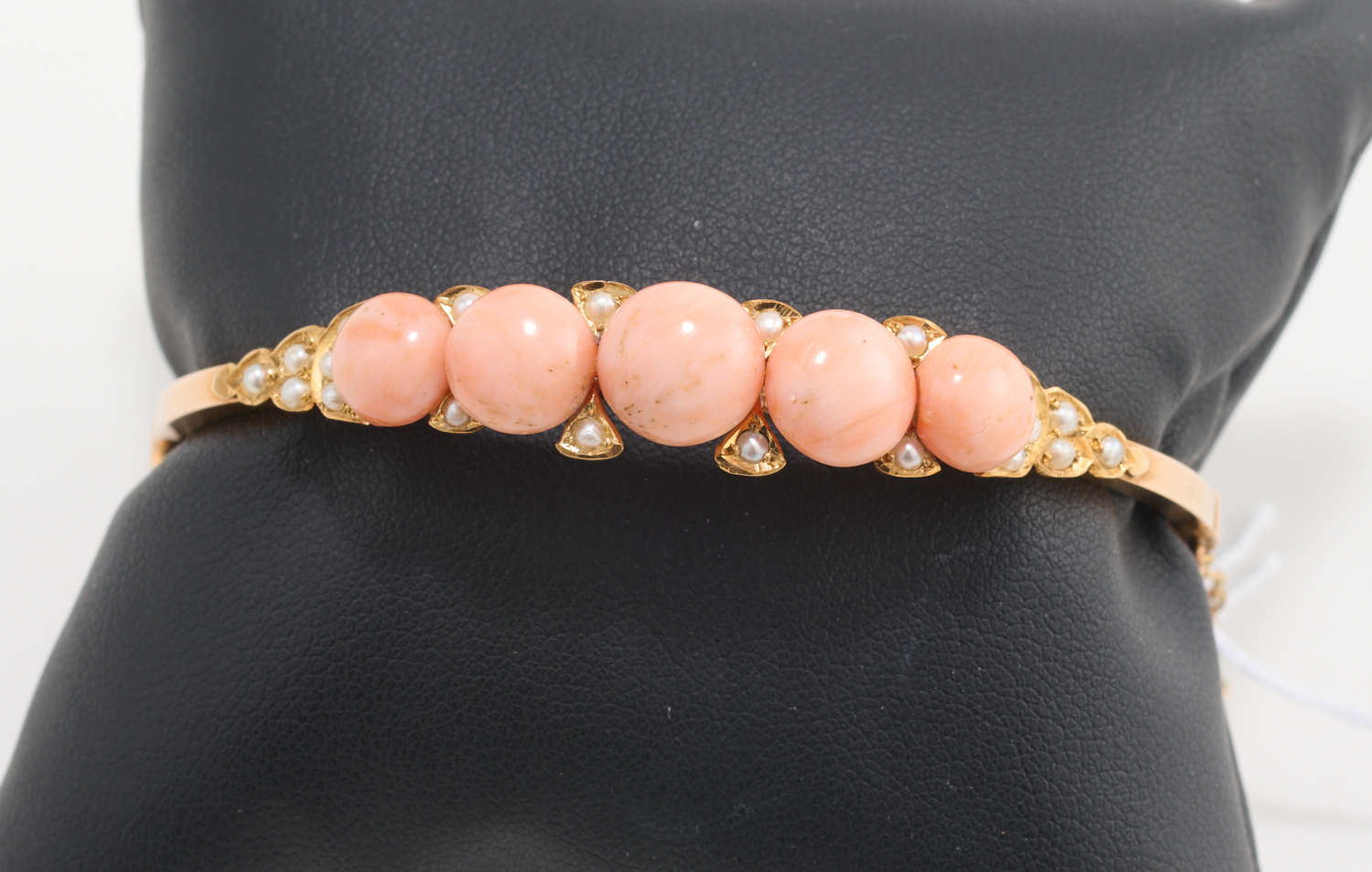 AN EDWARDIAN CORAL AND SEED PEARL BANGLE IN 13CT GOLD (XRF TESTED), DIAMETER 60MM, 17GMS