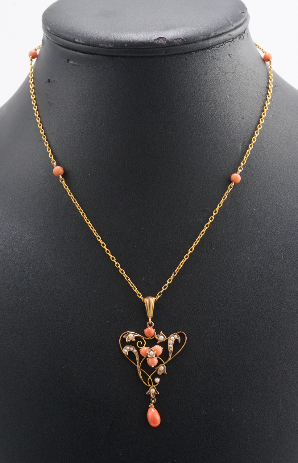AN EDWARDIAN SEED PEARL AND CORAL PENDANT NECKLACE IN 9CT GOLD, 6.0GMS