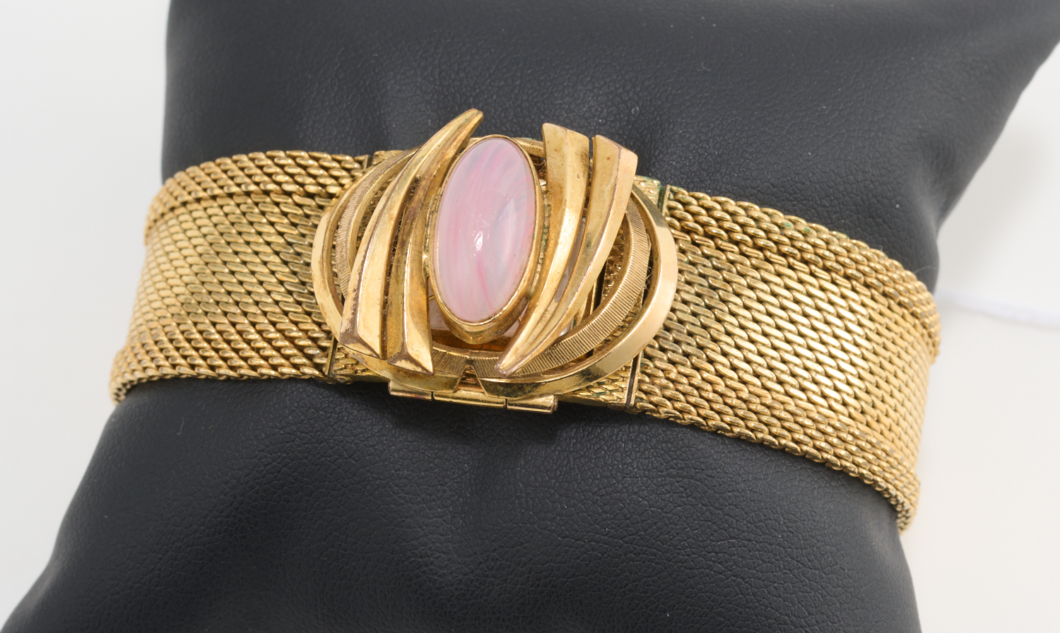 A COCKTAIL STYLE GEM-SET WRISTWATCH BY FISHCHER, THE BRACELET WITH CONSEALED DIAL, GOLD PLATED, BAND WIDTH APPROXIMATELY 2CM