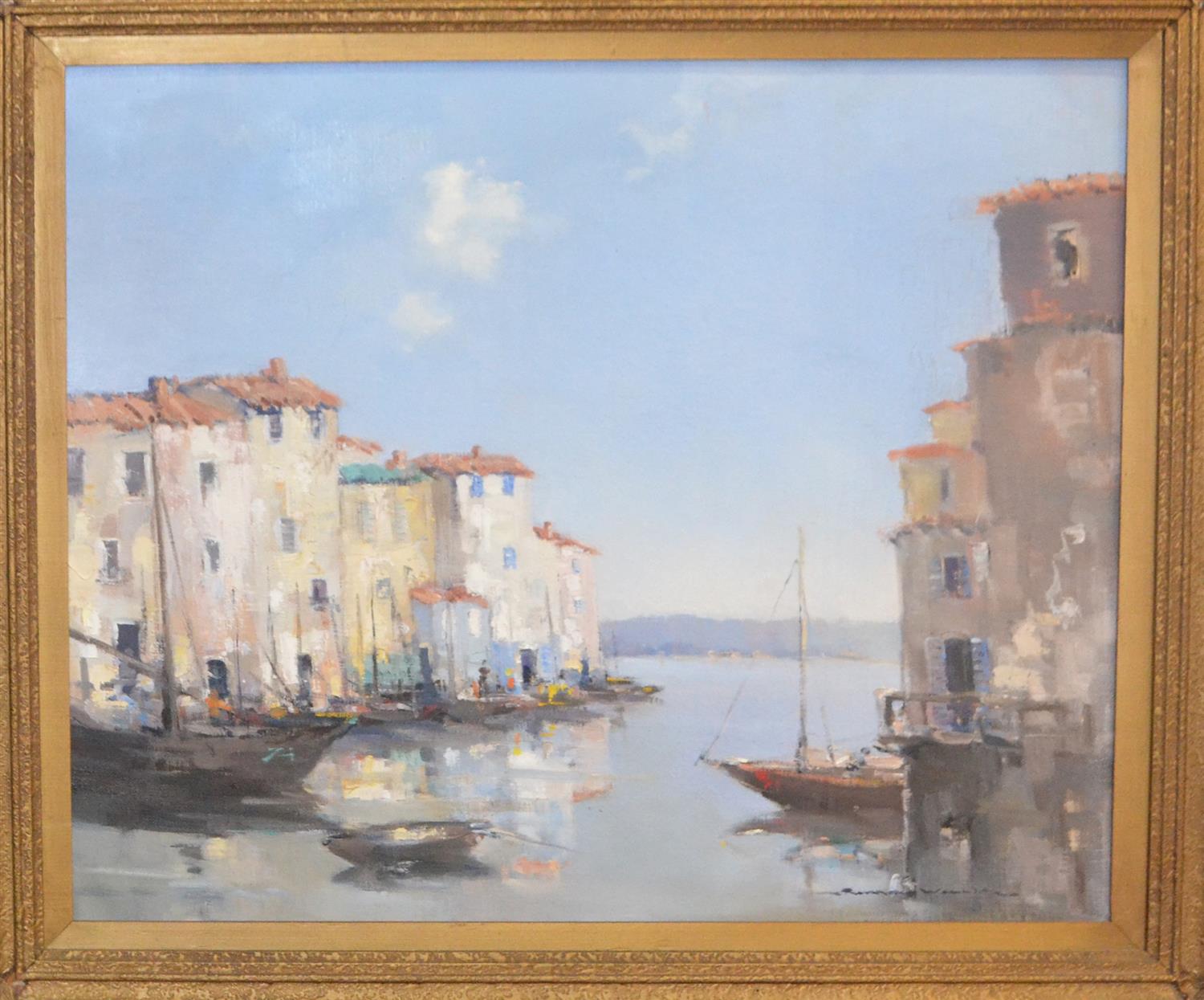 RAYMOND WALLIS, EUROPEAN HARBOUR SCENE, OIL ON CANVAS, 50 X 60CM, CONDITION: VERY GOOD, FRAME BEARS LOSSES, FRAME SIZE: 71 X 81CM