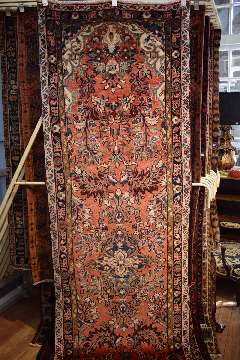 A PERSIAN MEHRABAN HALL RUNNER. 100% WOOL. DENSE PILE & SOLID, NATURAL DYES. HAND-KNOTTED VILLAGE WEAVE AND DESIGN OF CONTINUING FLORAL SPAYS AND A CENTRAL MEDALLION CONTAINING FLORAL PATTERNS SET WITHIN A SOFT PEACH TONED FIELD WITH TURQUOISE AND DEEP BLUE. SIZE: 355X105CM ORIGIN: IRAN - RRP: $2,400 CERTIFICATE OF AUTHENTICITY INCLUDED