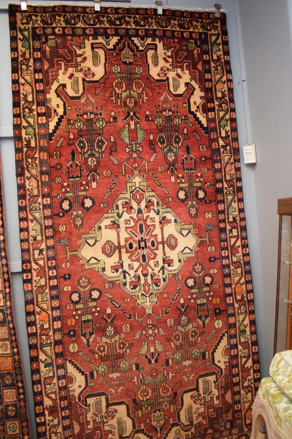 A PERSIAN NAHAVAND RUG. 100% WOOL. NATURAL DYES. SOLID AND DENSE. HAND-KNOTTED VILLAGE WEAVE WITH RARE DESIGN OF BOLD STYLIZED MEDALLION SET WITHIN A FIELD OF VARYING FLORAL & TRIBAL PATTERNS. BORDER OF FLORAL SHRUBS & GEOMETRIC PATTERNS. CERTIFICATE OF AUTHENTICITY INCLUDED. SIZE: 300X146CM ORIGIN: PERSIA - RRP: $3,300