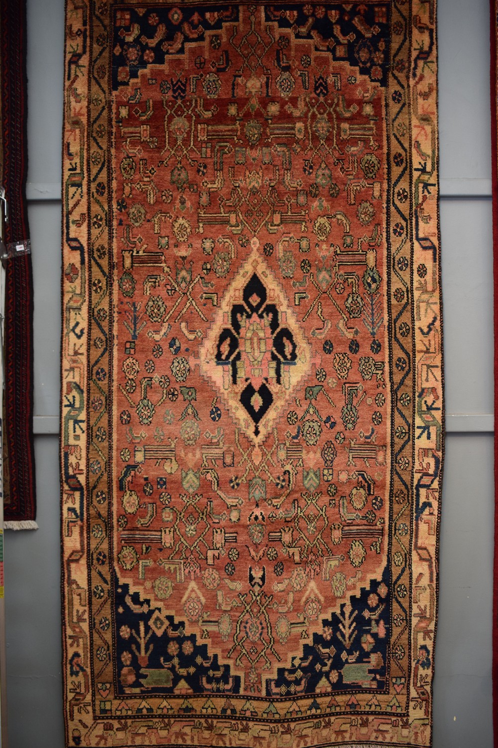 A TRIBAL PERSIAN SONQOR KOLYAIE RUG. HAND SPUN WOOL, NATURAL DYES & ABRASH COLOURS. VILLAGE WEAVE FROM THE KURDISTAN REGION WITH TRIBAL DESIGN OF DIAMOND SHAPE MEDALLION CONTAINING A FLORAL SPRAY ON A RUST TONE FIELD AND CORNER MEDALLIONS WITH TREE OF LIFE PATTERNS ON A CHARCOAL FIELD. BORDER OF ROSETTES AND TRIBAL MOTIS. SIZE: 270X130CM ORIGIN: IRAN - RRP: $2,200 CERTIFICATE OF AUTHENTICITY INCLUDED.