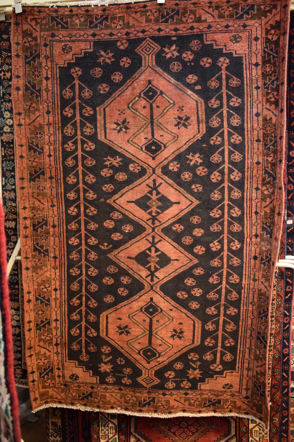 A RARE & COLLECTABLE CIRCA 1950'S PERSIAN KOHI RUG, 100% WOOL. NATURAL DYES WITH NATURAL ABRASH DISCOLORATION. VINTAGE PILE. HAND-KNOTTED TRIBAL WEAVE WITH DESIGN OF BOLD ANCHORED MEDALLIONS IN A FIELD OF TRIBAL PATTERNS ON A CHARCOAL FIELD. BORDER OF TRIBAL MOTIFS. RESTORED TO GALLERY CONDITION. CERTIFICATE OF AUTHENTICITY INCLUDED. SIZE: 199X131CM ORIGIN: PERSIA - RRP: $2,600 CERTIFICATE OF AUTHENTICITY INCLUDED.