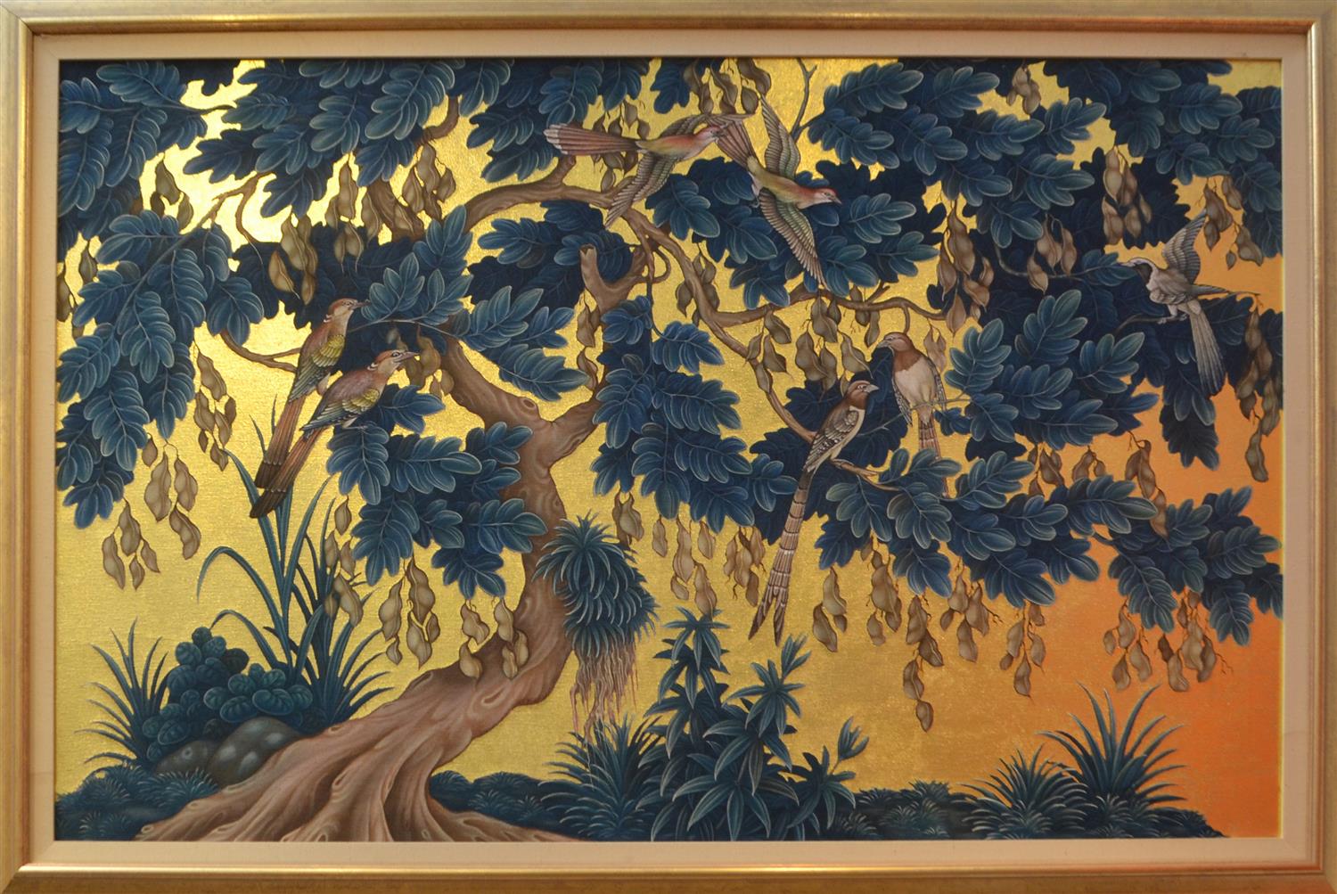 INDONESIAN SCHOOL, BIRDS I, ACRYLIC AND GOLD LEAF ON CANVAS, 89 X 139CM, FRAME: 110 X 157CM