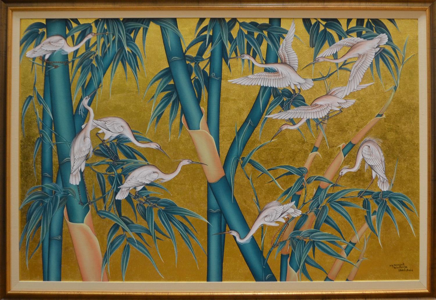 INDONESIAN SCHOOL, BIRDS II, ACRYLIC AND GOLD LEAF ON CANVAS, 89 X 139CM, FRAME: 107 X 156CM