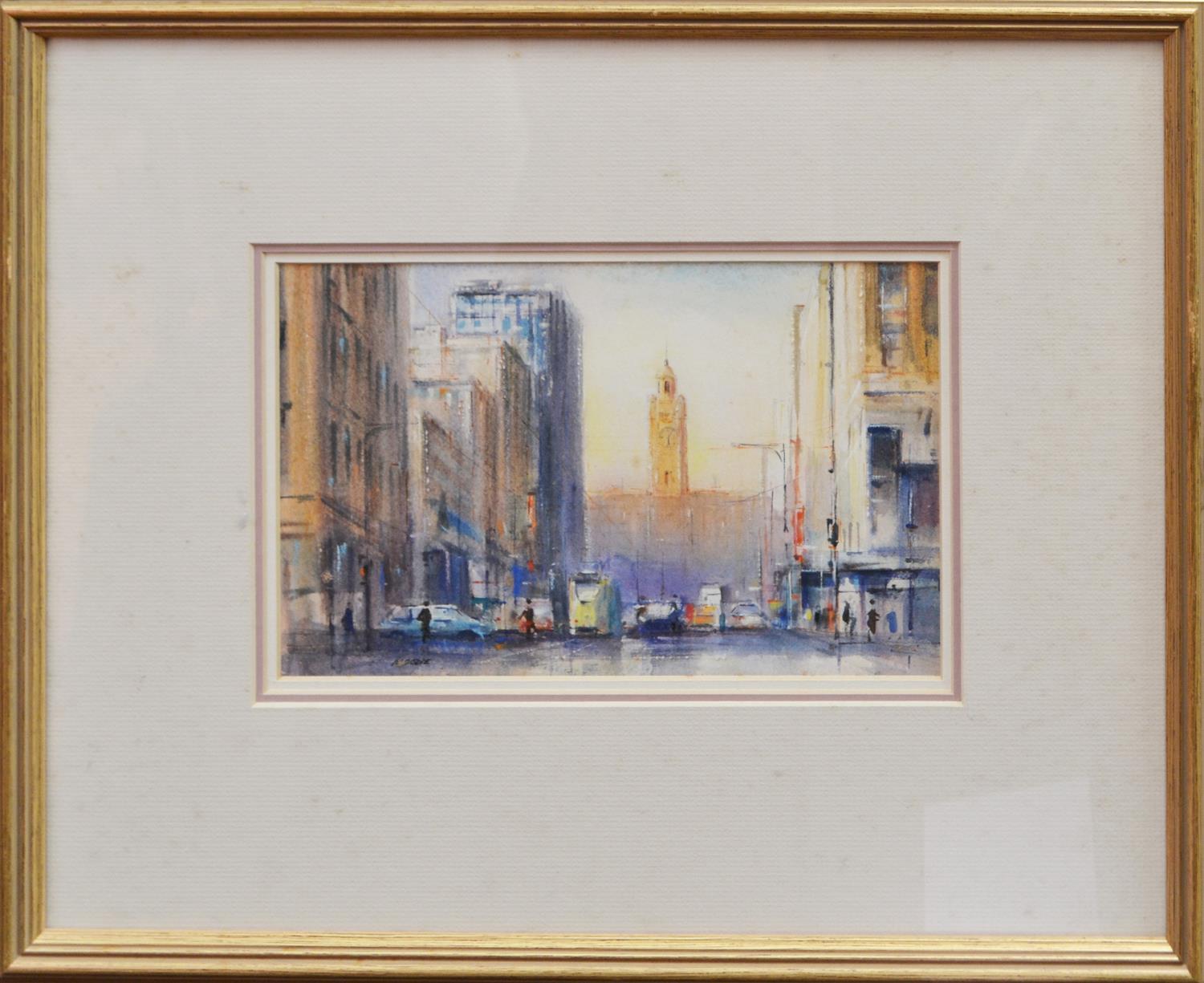 CHARLES MOODIE, MELBOURNE STREETSCAPE, WATERCOLOUR, 18 X 28CM