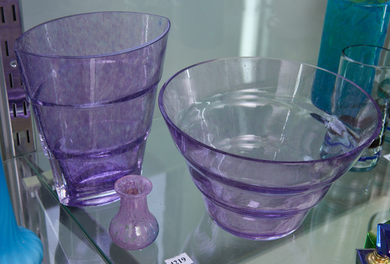 A GROUP OF PURPLE KOSTA BODA GLASS BOWL AND VASES (20 CM H), LEONARD JOEL LOCAL DELIVERY SIZE: SMALL