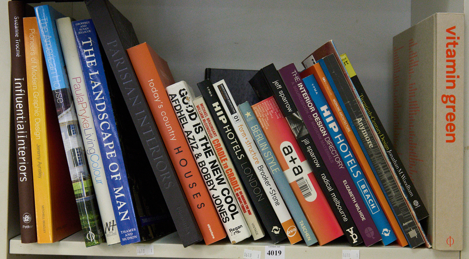 A SHELF OF BOOKS PERTAINING TO DESIGN AND ARCHITECTURE INCLUDING VITAMIN GREEN, PHAIDON, LEONARD JOEL LOCAL DELIVERY SIZE: SMALL