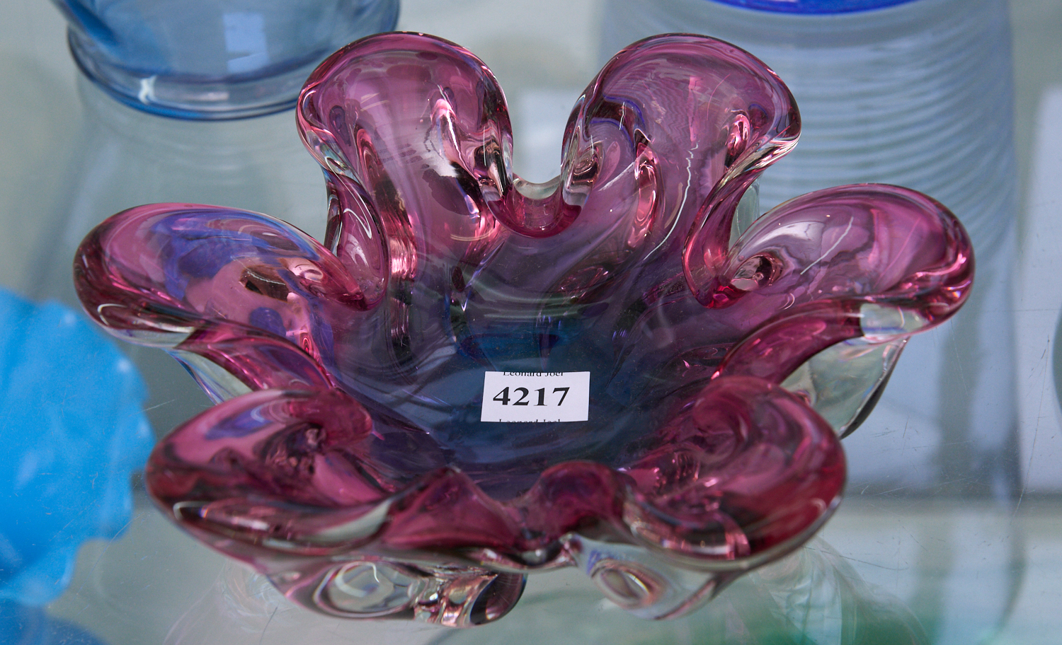 AN ART GLASS BOWL IN VIOLET AND PINK TONES W.20CM, LEONARD JOEL LOCAL DELIVERY SIZE: SMALL