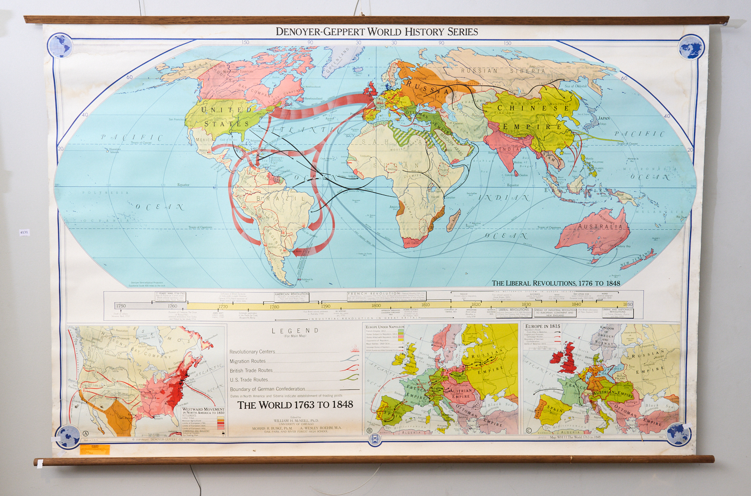 A LINEN BACKED EDUCATIONAL MAP, THE WORLD 1763-1848 (166 CM W), LEONARD JOEL LOCAL DELIVERY SIZE: SMALL