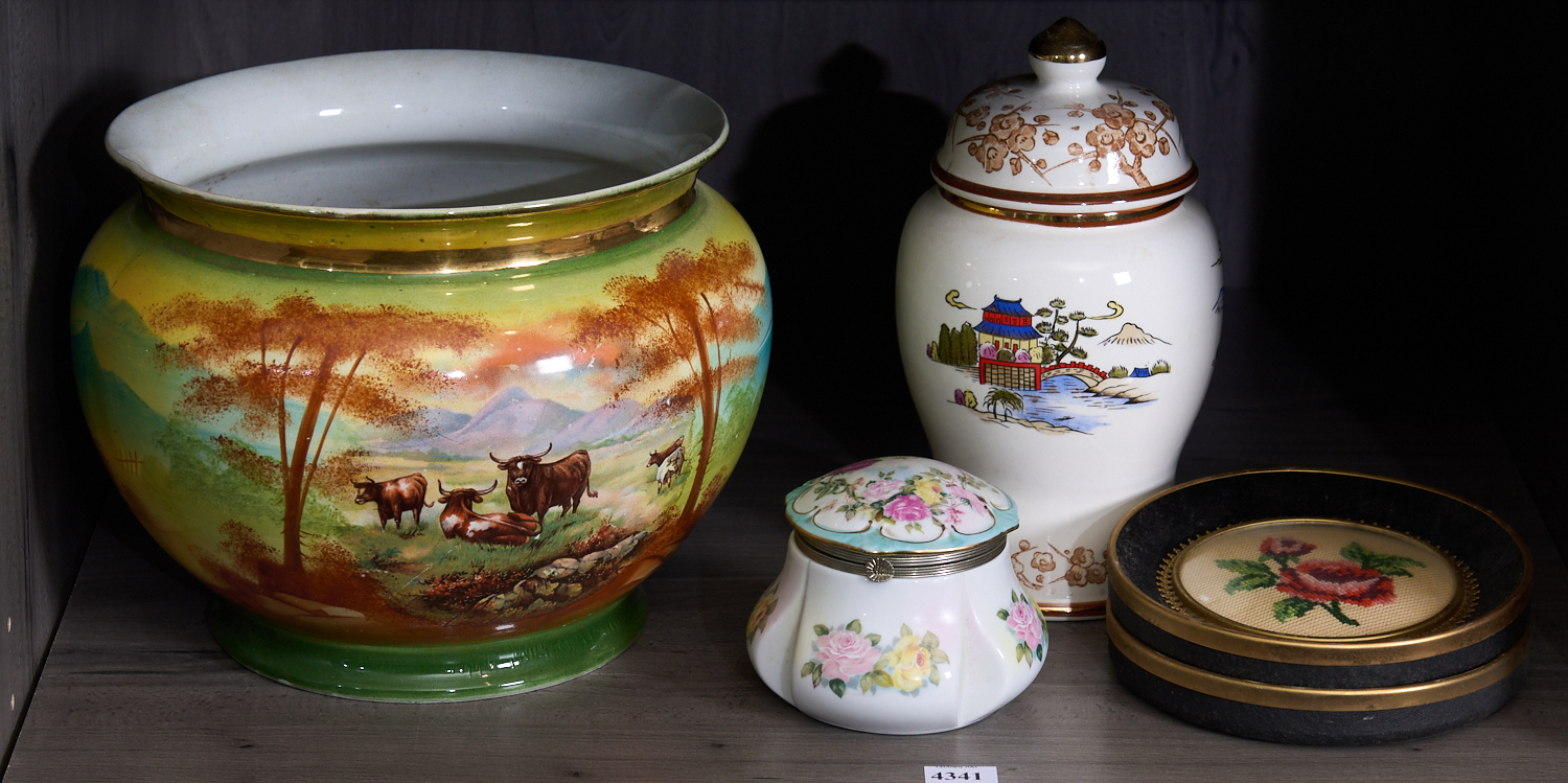 A SHELF OF VINTAGE ITEMS INCLUDING JARDINIERE, LEONARD JOEL LOCAL DELIVERY SIZE: SMALL