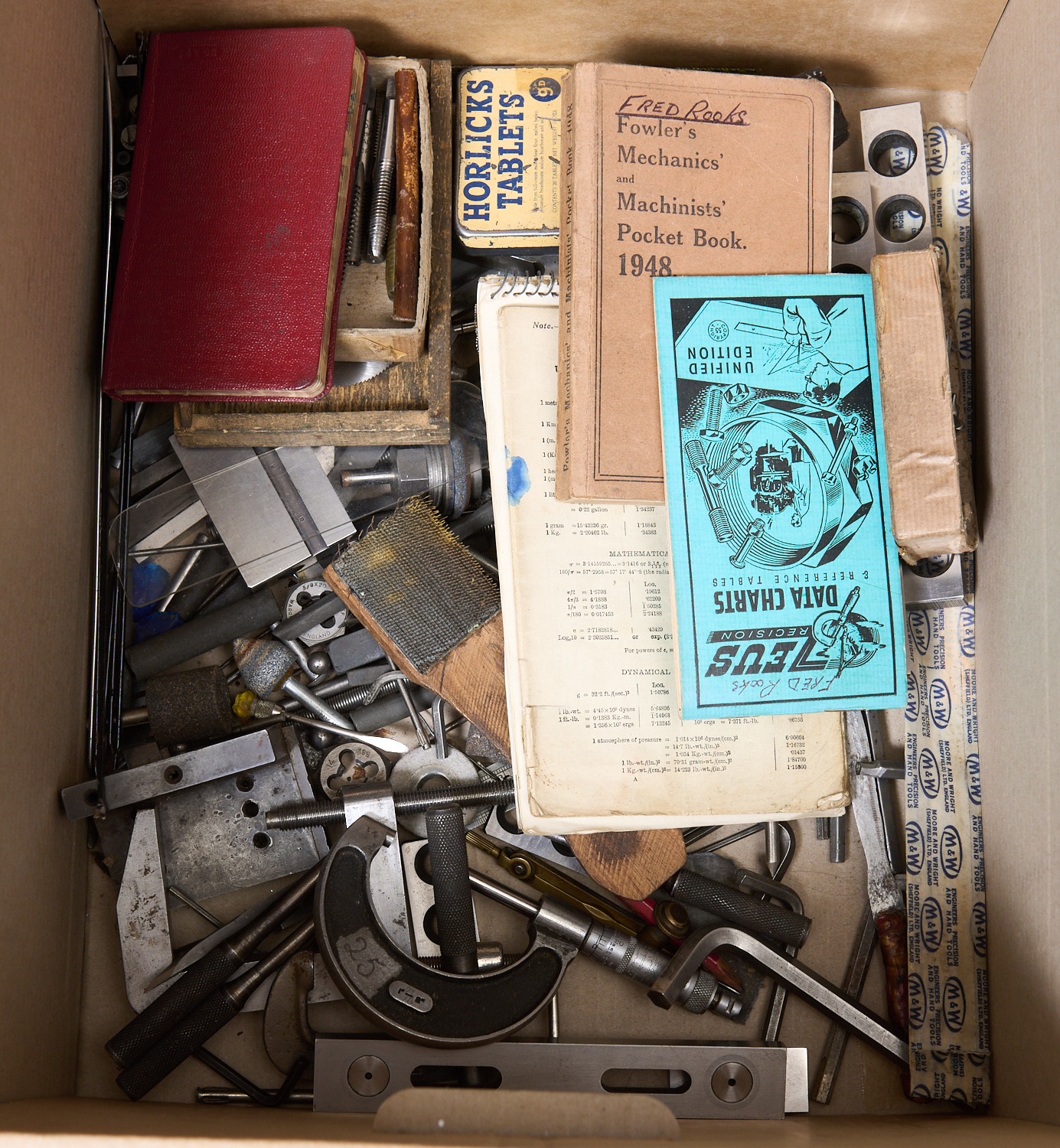 A BOX OF ASSORTED ENGINEERS/MACHINISTS TOOLS, LEONARD JOEL LOCAL DELIVERY SIZE: SMALL