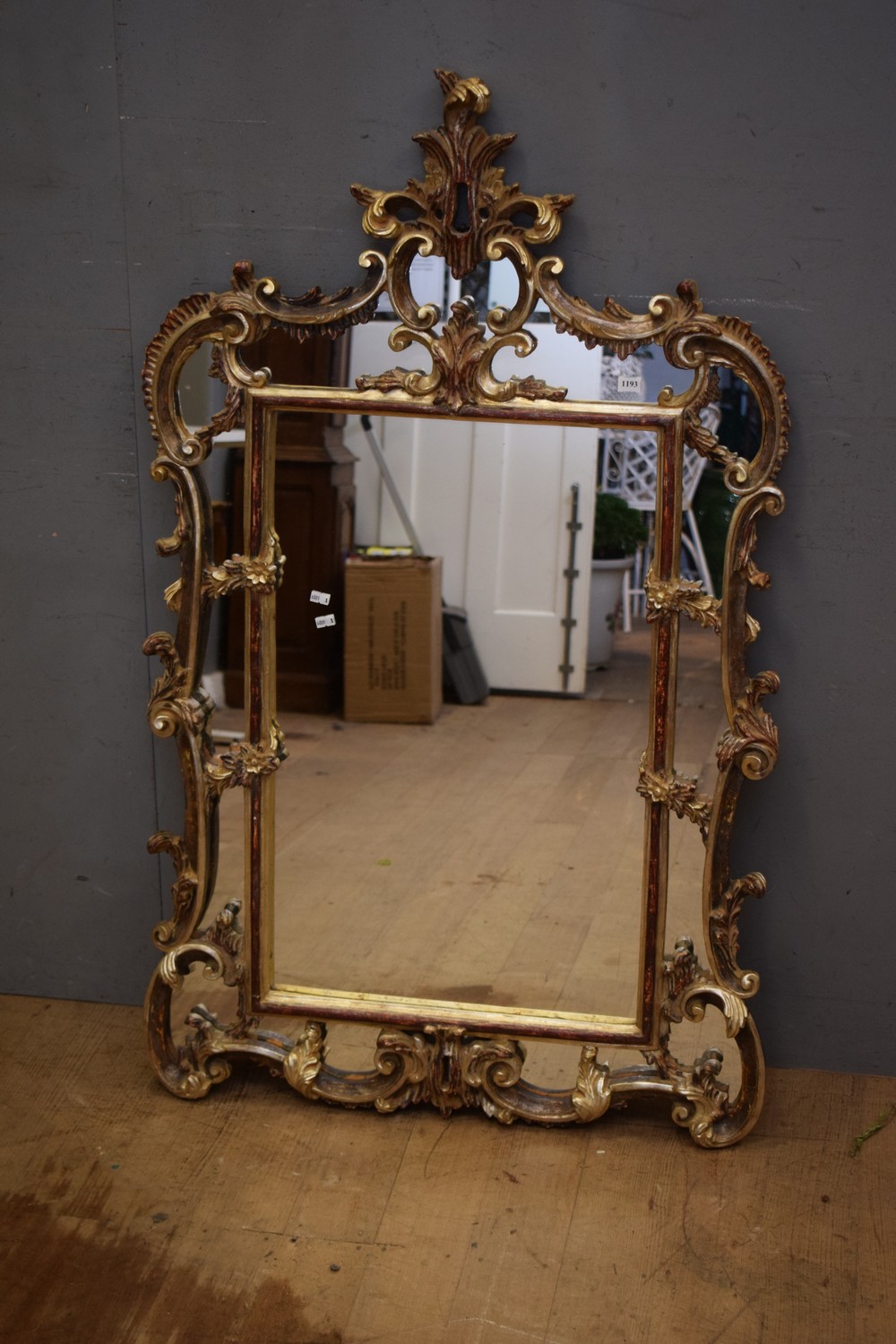 A DECORATIVELY CARVED ITALIAN GILTWOOD MIRROR (125H x 74W CM) (LEONARD JOEL DELIVERY SIZE: LARGE)