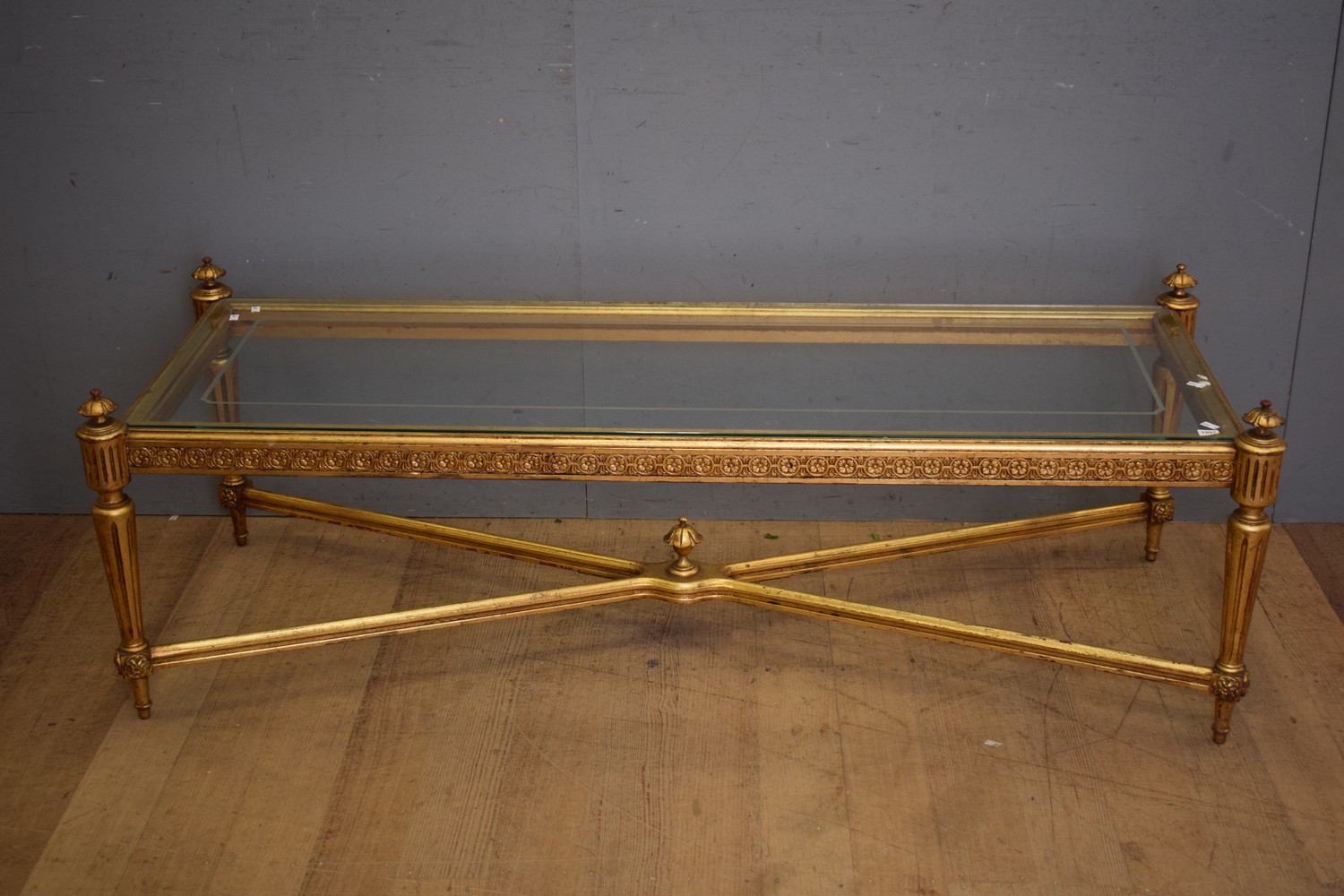 A LOUIS XVI STYLE GILTWOOD COFFEE TABLE WITH CROSS BASE AND GLASS TOP (48H x 148W x 56D CM) (LEONARD JOEL DELIVERY SIZE: LARGE)