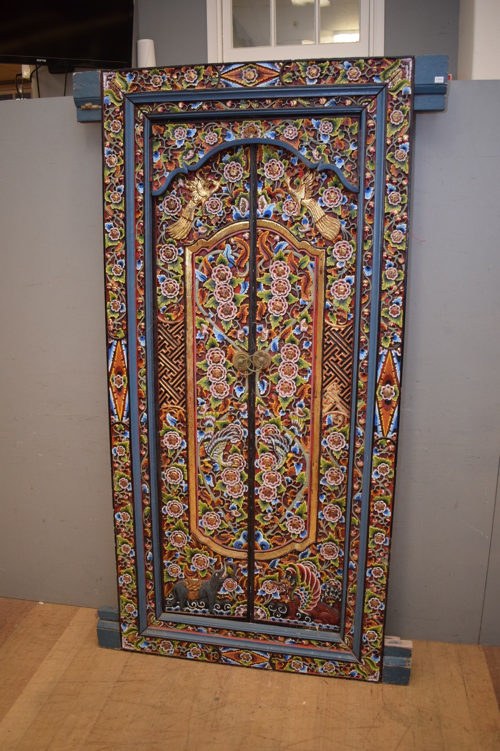 A SUBSTANTIAL CARVED TIMBER HAND PAINTED BALINESE DOOR (A/F) (216H x 122W x 14D CM) (PLEASE NOTE THIS HEAVY ITEM MUST BE REMOVED BY CARRIERS AT THE CUSTOMER'S EXPENSE. LEONARD JOEL STAFF CANNOT ASSIST CARRYING THIS ITEM) (X-LARGE ITEM)