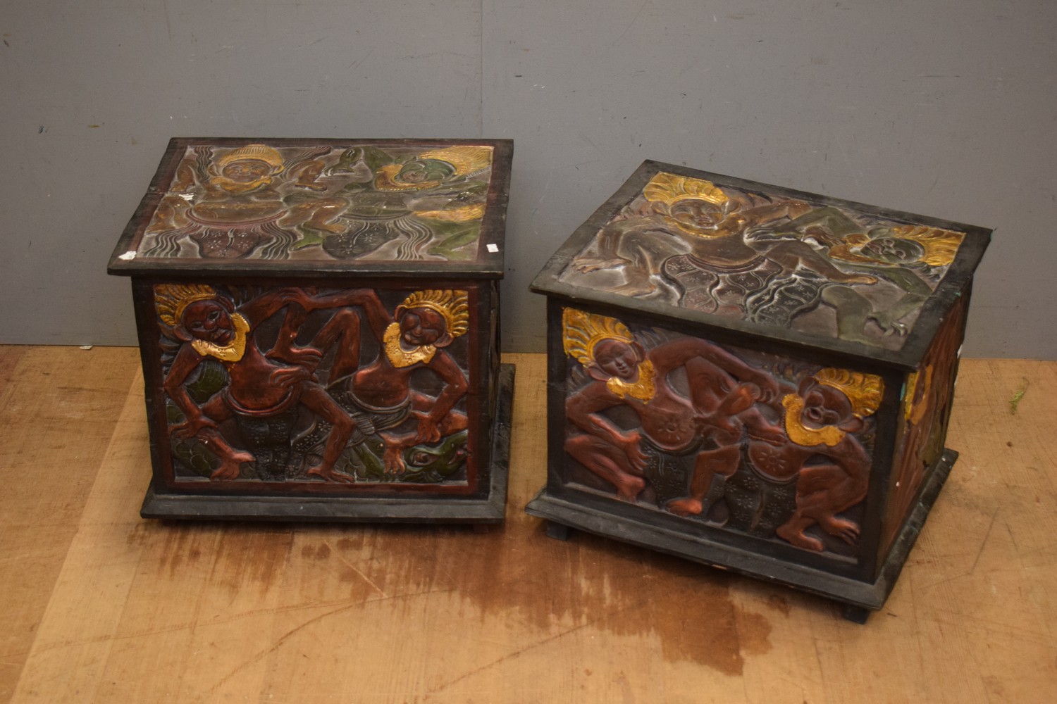 TWO CARVED BALINESE BOXES (A/F) (44H x 54W x 44D CM) (LEONARD JOEL DELIVERY SIZE: LARGE)