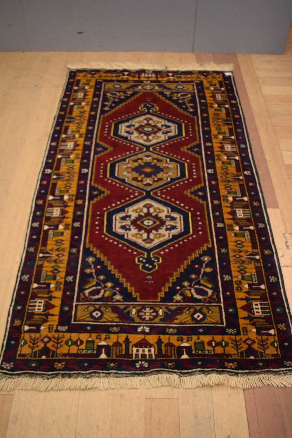 A 100% WOOL HANDMADE RUG WITH TURKISH HOUSE BORDER (213 x 106 CM) (LEONARD JOEL DELIVERY SIZE: MEDIUM)