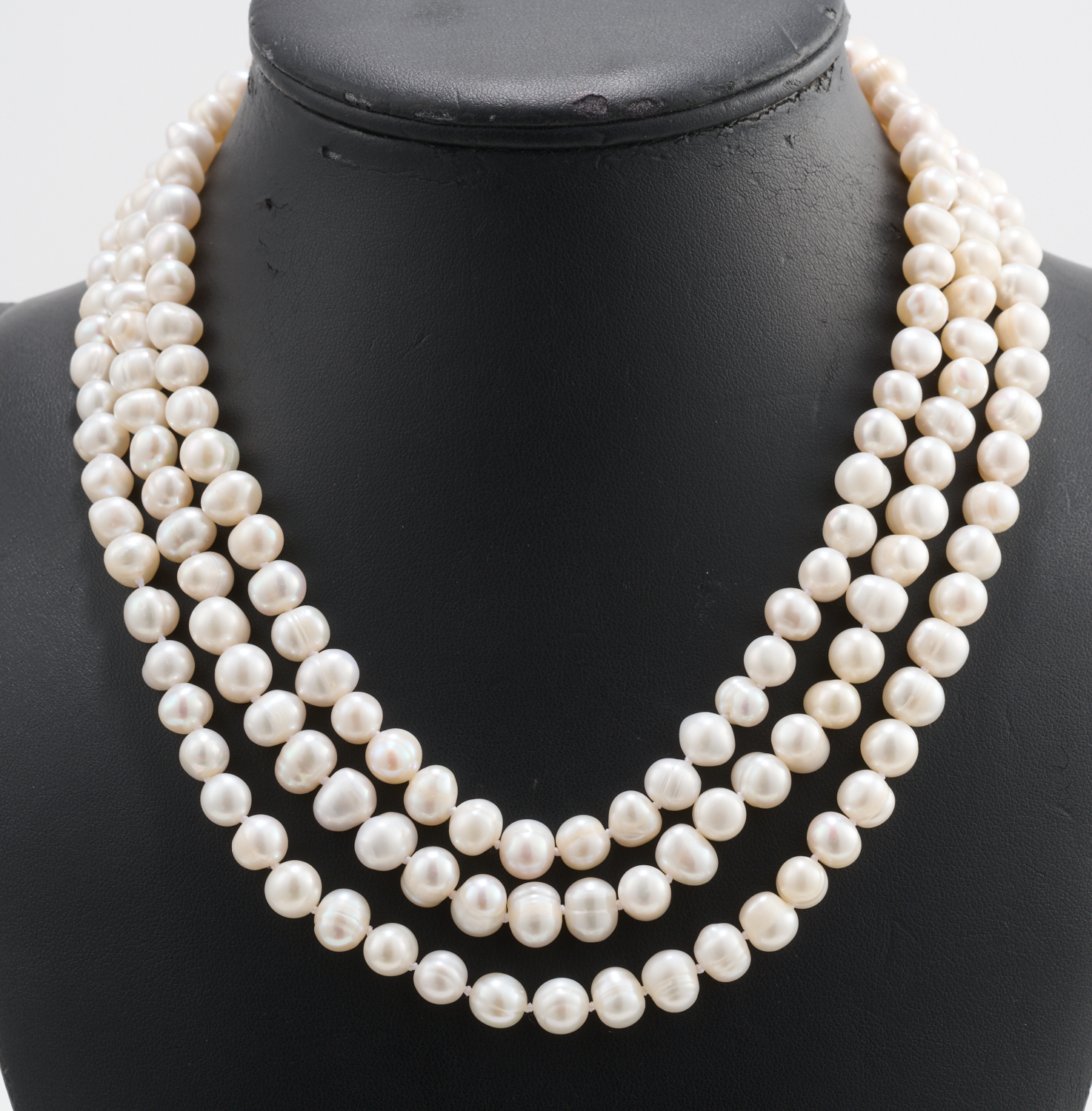 A TRIPLE STRAND OF FRESH WATER PEARLS, PEARL DIAMETER APPROXIMATELY 0.9CM, TOTAL LENGTH APPROXIMATELY 450MM