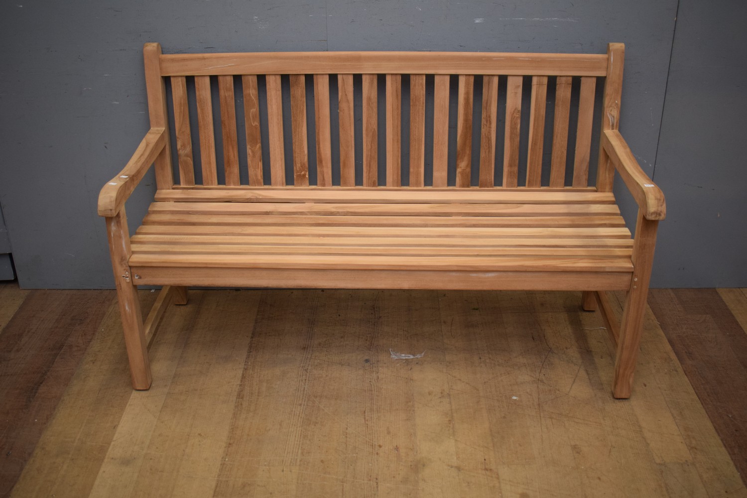 A LONG BACK TEAK BENCH SEAT (93H x 150W x 63D CM) (PLEASE NOTE THIS HEAVY ITEM MUST BE REMOVED BY CARRIERS AT THE CUSTOMER'S EXPENSE. LEONARD JOEL STAFF CANNOT ASSIST CARRYING THIS ITEM) (X-LARGE ITEM)