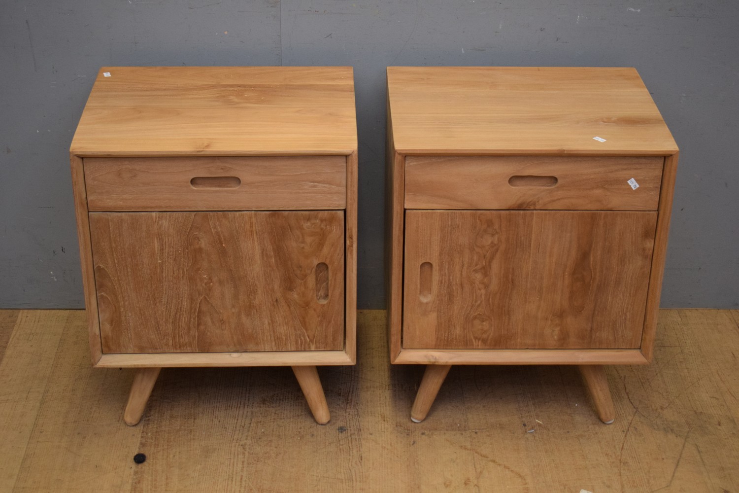 A PAIR OF MID-CENTURY STYLE TEAK BEDSIDE TABLES (61H x 50W x 40D CM) (LEONARD JOEL DELIVERY SIZE: LARGE)