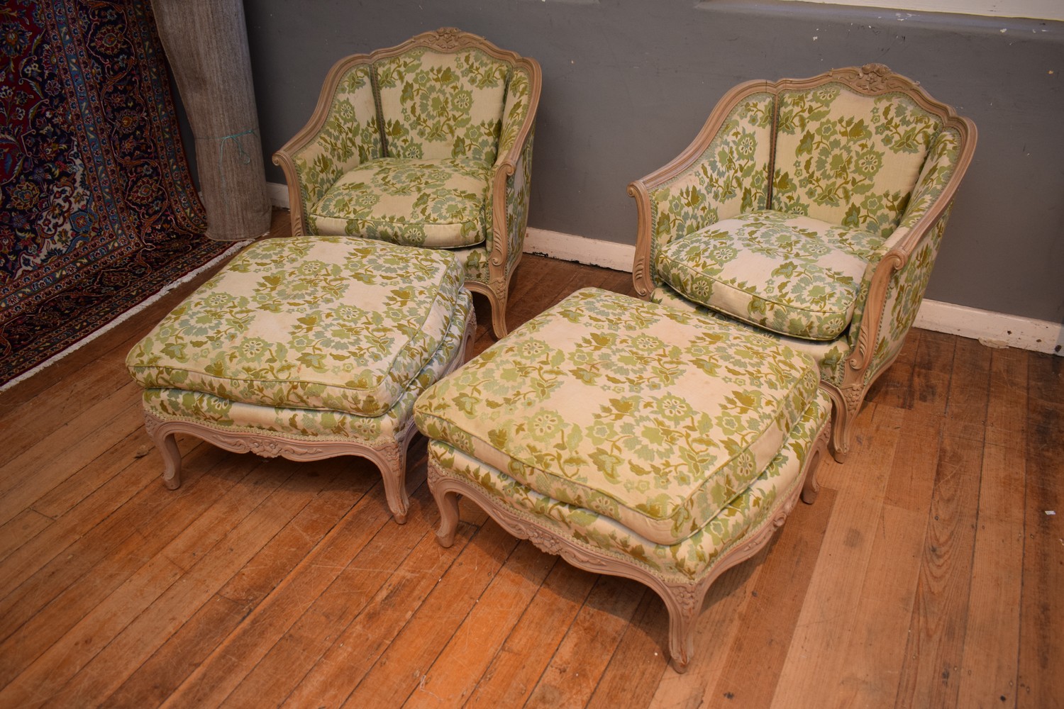 A PAIR OF LOUIS XV STYLE UPHOLSTERED ARMCHAIRS WITH MATCHING OTTOMANS (A/F) ( 85H X 74W X 76D CM) (PLEASE NOTE THIS HEAVY ITEM MUST BE REMOVED BY CARRIERS AT THE CUSTOMER'S EXPENSE. LEONARD JOEL STAFF CANNOT ASSIST CARRYING THIS ITEM) (X-LARGE ITEM)