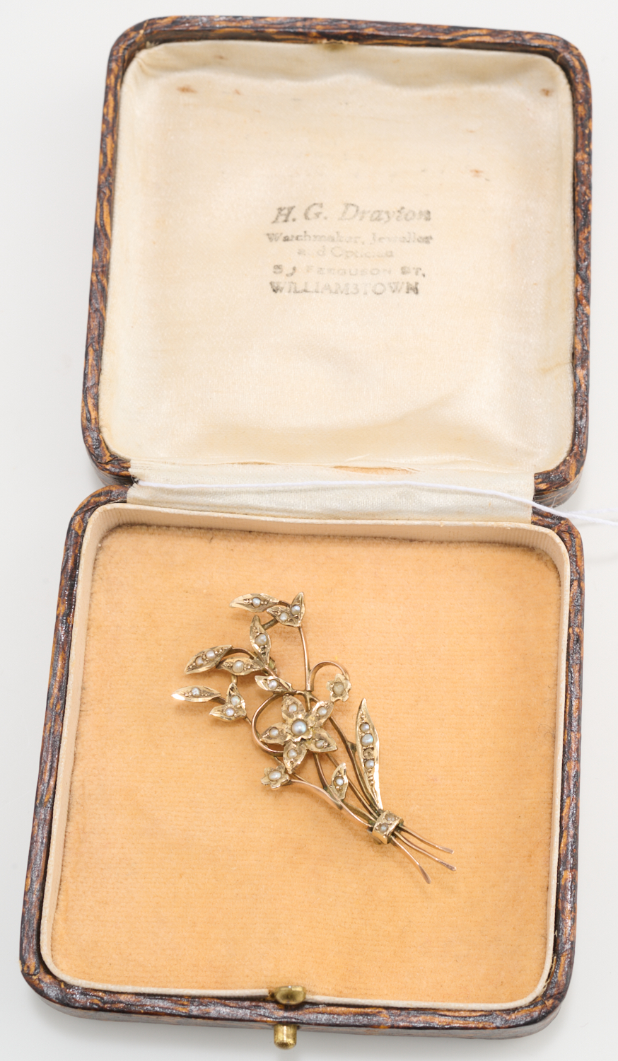 AN AUSTRALIAN SEED PEARL SET SPRAY STYLE BROOCH IN 9CT GOLD, 4.3GMS