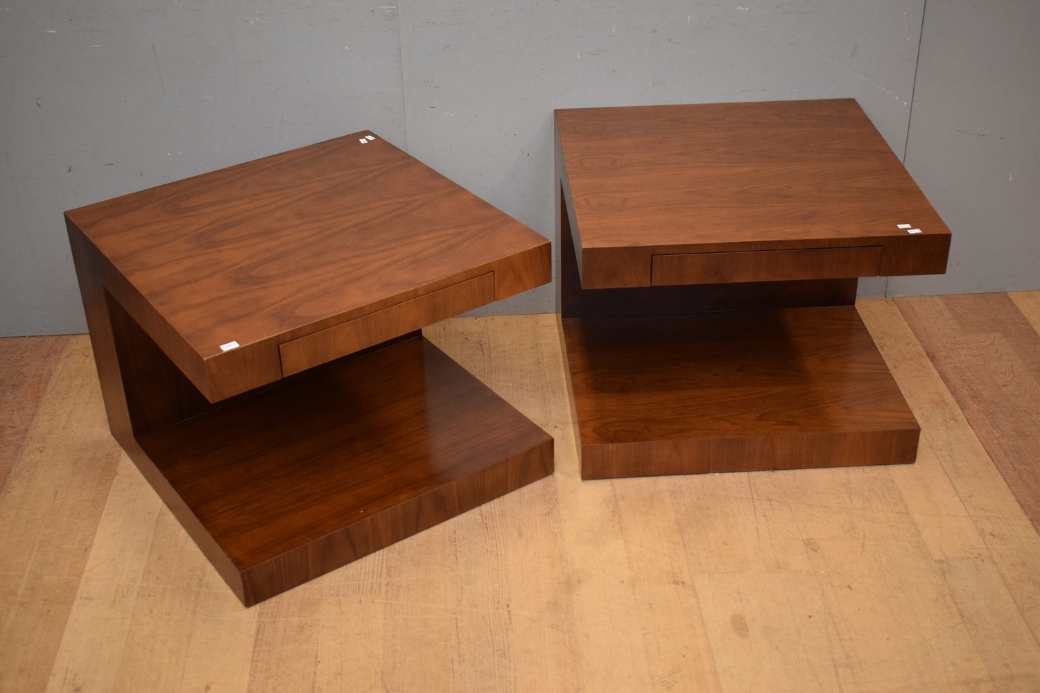 A PAIR OF CONTEMPORARY WALNUT LAMP TABLES WITH DISCREET DRAWER (A/F) (50H x 65W x 65D CM) (LEONARD JOEL DELIVERY SIZE: LARGE)