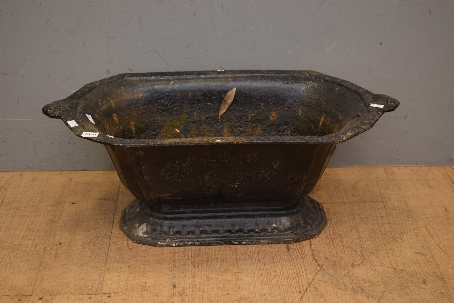A 19TH CENTURY FRENCH CAST-IRON PLANTER WITH RAISED FLORAL DECORATION TO ONE SIDE AND FLUTED SIDES (22H x 61W x 32D CM) (LEONARD JOEL DELIVERY SIZE: MEDIUM)
