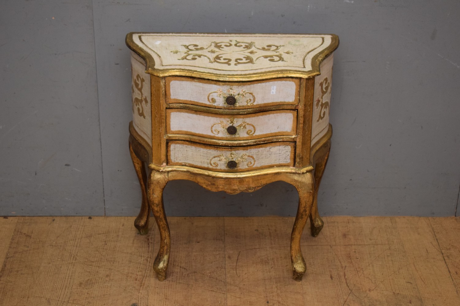 AN ITALIAN GILTWOOD FLORENTINE THREE DRAWER CHEST OF DRAWERS WITH CREAM DETAILING AND ORIGINAL BRASS HANDLES (65H x 58W x 31D CM) (LEONARD JOEL DELIVERY SIZE: LARGE)