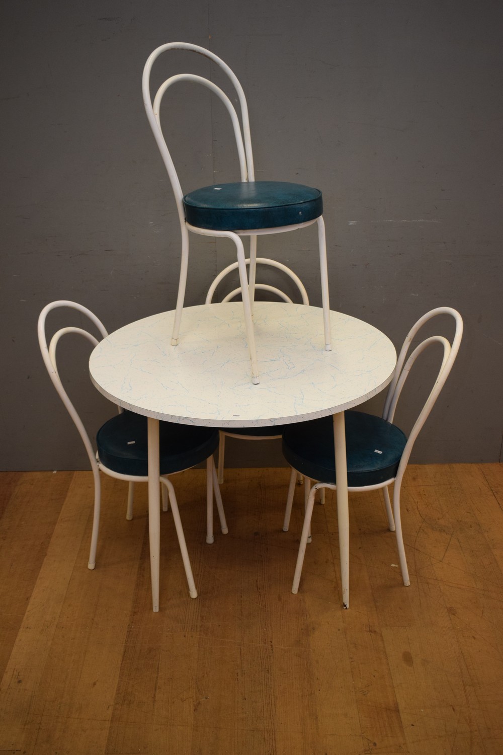 A1960S AUSTRALIAN MADE RETRO CIRCULAR LAMINEX TABLE WITH BLUE FLECKS AND FOUR MATCHED CHAIRS WITH BLUE SEATS (A/F) (TABLE 73H x 91D CM) (PLEASE NOTE THIS HEAVY ITEM MUST BE REMOVED BY CARRIERS AT THE CUSTOMER'S EXPENSE. LEONARD JOEL STAFF CANNOT ASSIST CARRYING THIS ITEM) (X-LARGE ITEM)