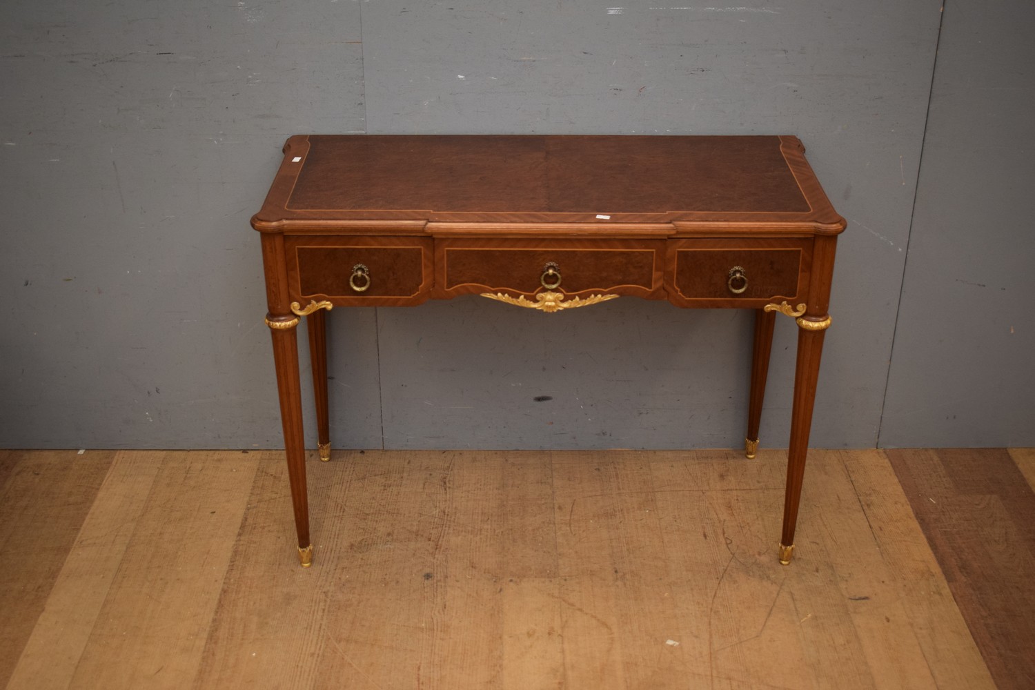 A FRENCH KINGWOOD EMPIRE STYLE INLAID SIDE TABLE WITH THREE DRAWERS AND ORIGINBAL BRASS HANDLES (74H x 101W x 46D CM) (LEONARD JOEL DELIVERY SIZE: LARGE)