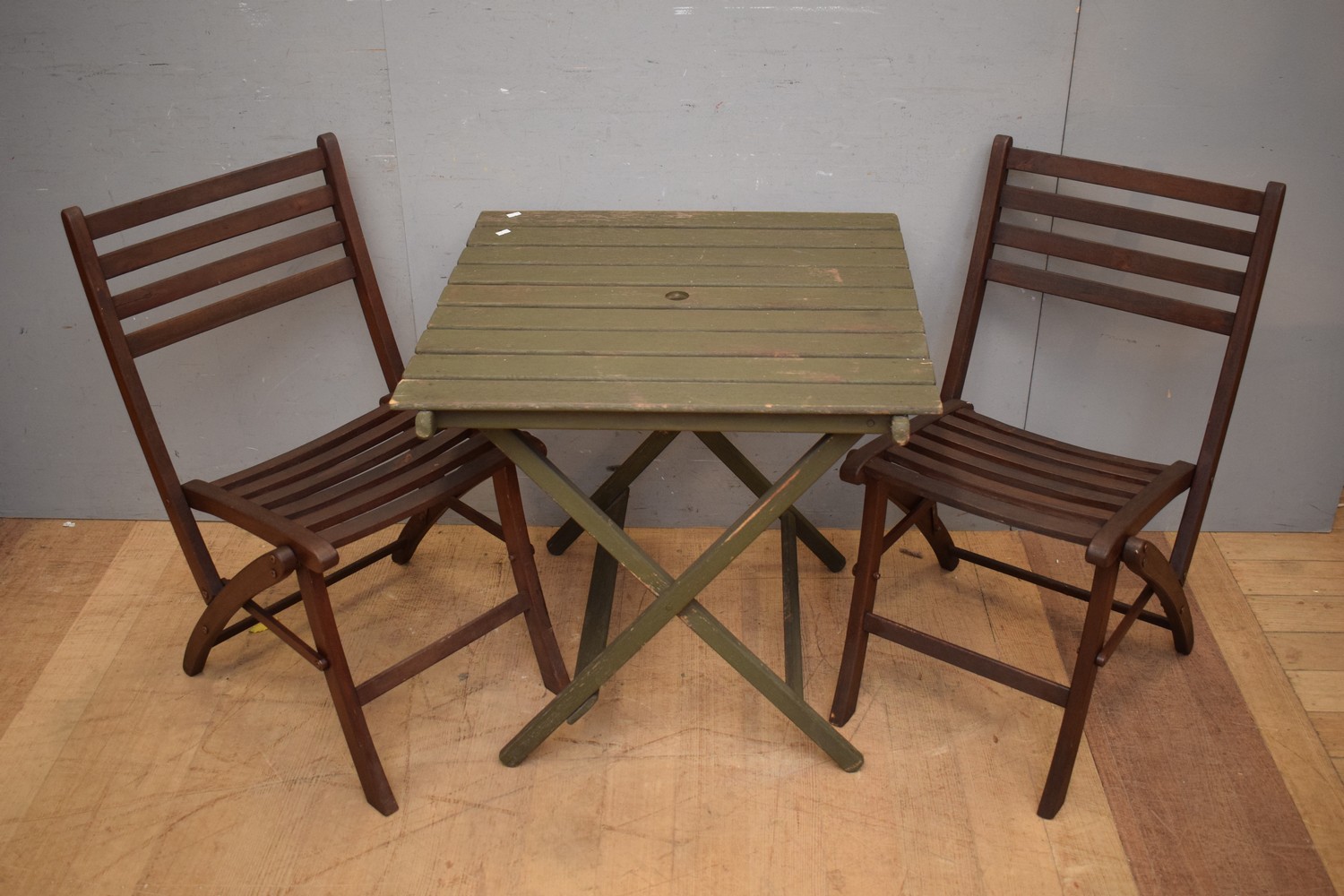 A THREE PIECE AUSTRALIAN MADE SOLID TEAK FOLDING OUTDOOR PATIO TABLE AND CHAIRS ( 67H X 69W X 69D CM) (LEONARD JOEL DELIVERY SIZE: LARGE)