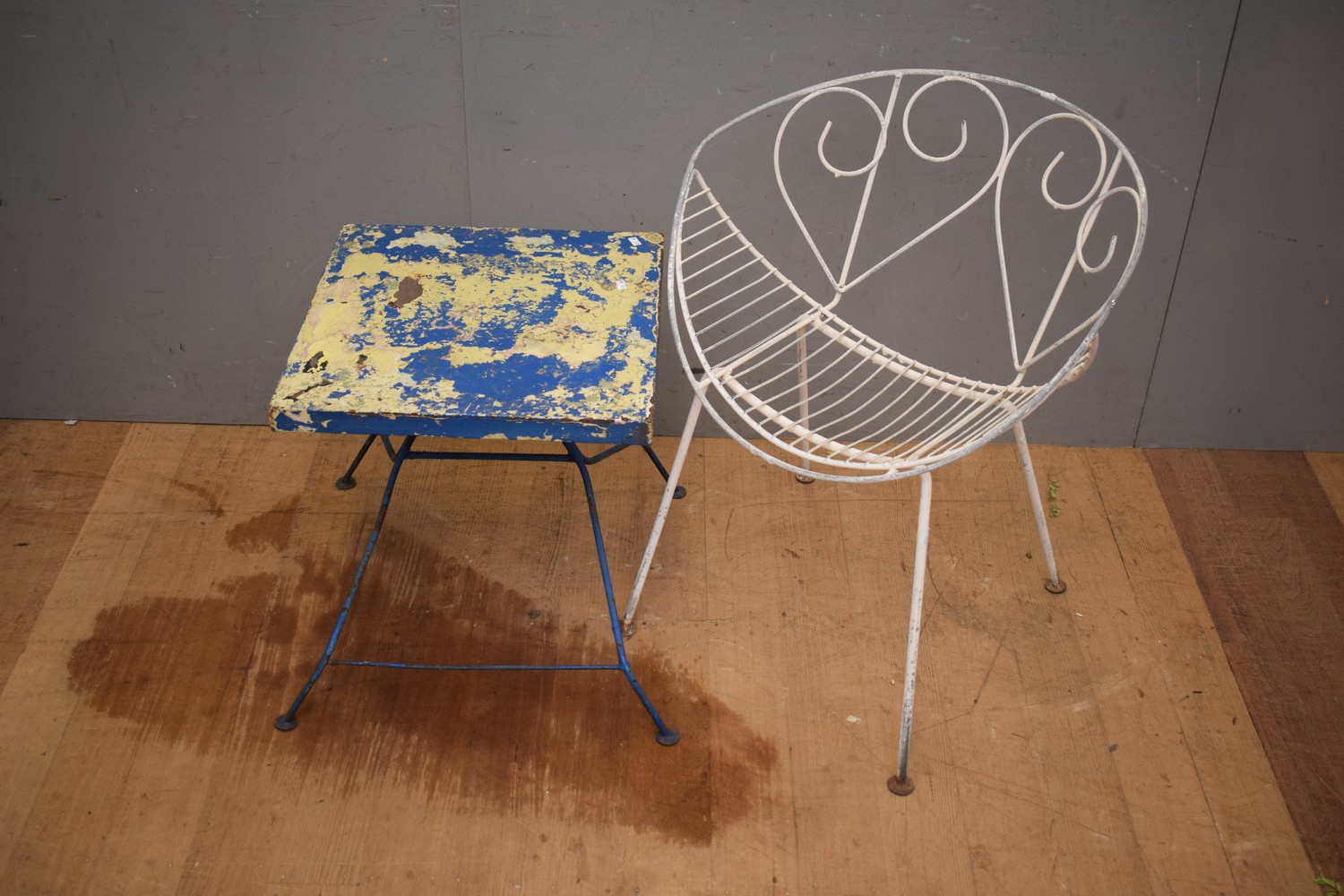 A RETRO METAL CURVED FORM PAINTED WHITE CHAIR AND MATCHED FORM TABLE IN BLUE DISTRESSED LOOK (A/F) (TABLE 49H x 45W x 45D CM) (LEONARD JOEL DELIVERY SIZE: LARGE)