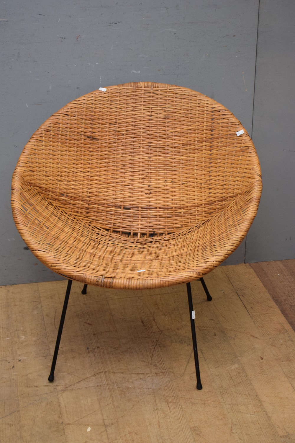 A CANE AND METAL SAUCER FORM CHAIR (A/F)  ( 70H X 70W X 60D CM) (LEONARD JOEL DELIVERY SIZE: MEDIUM)