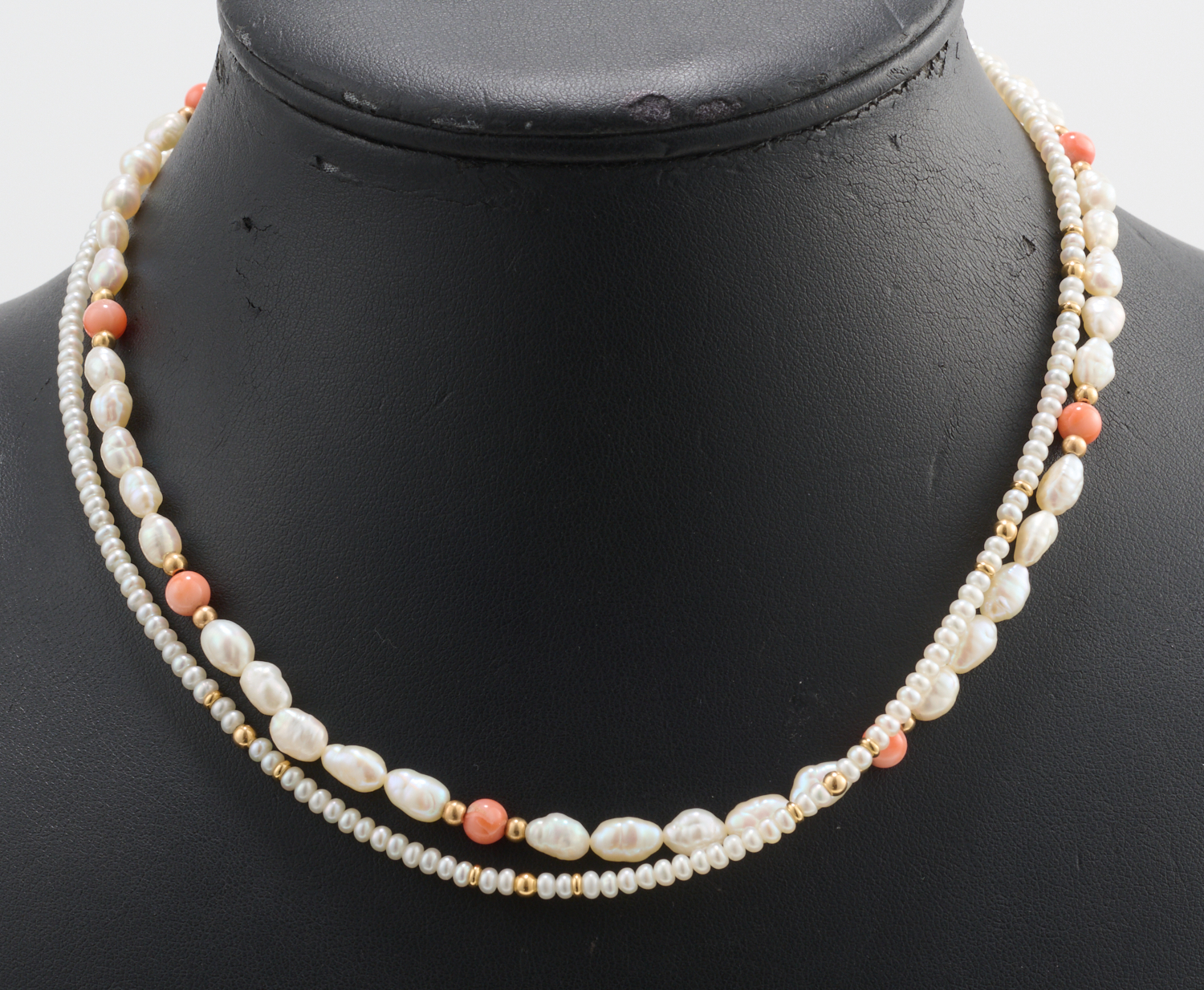 A PEARL AND GOLD BEAD NECKLACE TO A 14CT GOLD CLASP, TOGETHER WITH A STRAND OF FRESHWATER PEARLS WITH GLASS BEAD SPACERS, APPROXIMATE LENGTH OF EACH 44CM