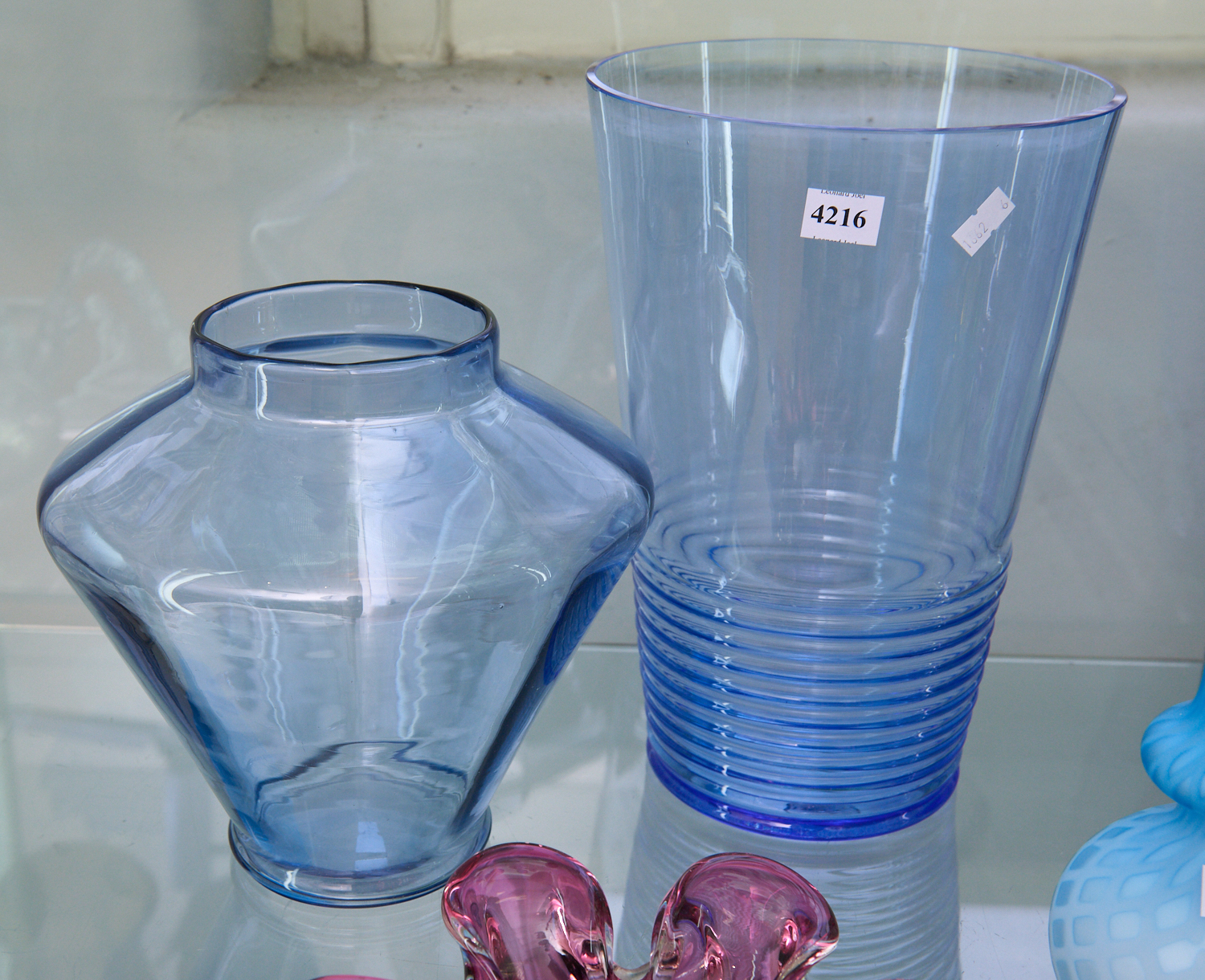 TWO BLUE GLASS VASES (29 CM H), LEONARD JOEL LOCAL DELIVERY SIZE: SMALL