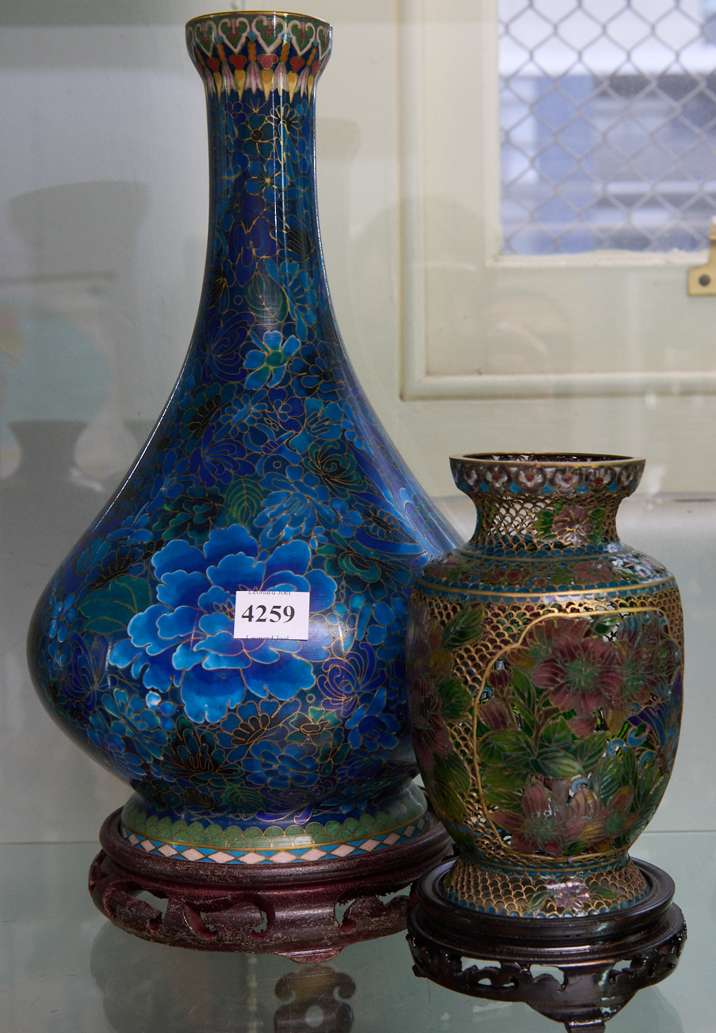 CLOISONNE VASE ON STAND TOGETHER WITH A PLIQUE A JOUR VASE (35.5 CM H), LEONARD JOEL LOCAL DELIVERY SIZE: SMALL