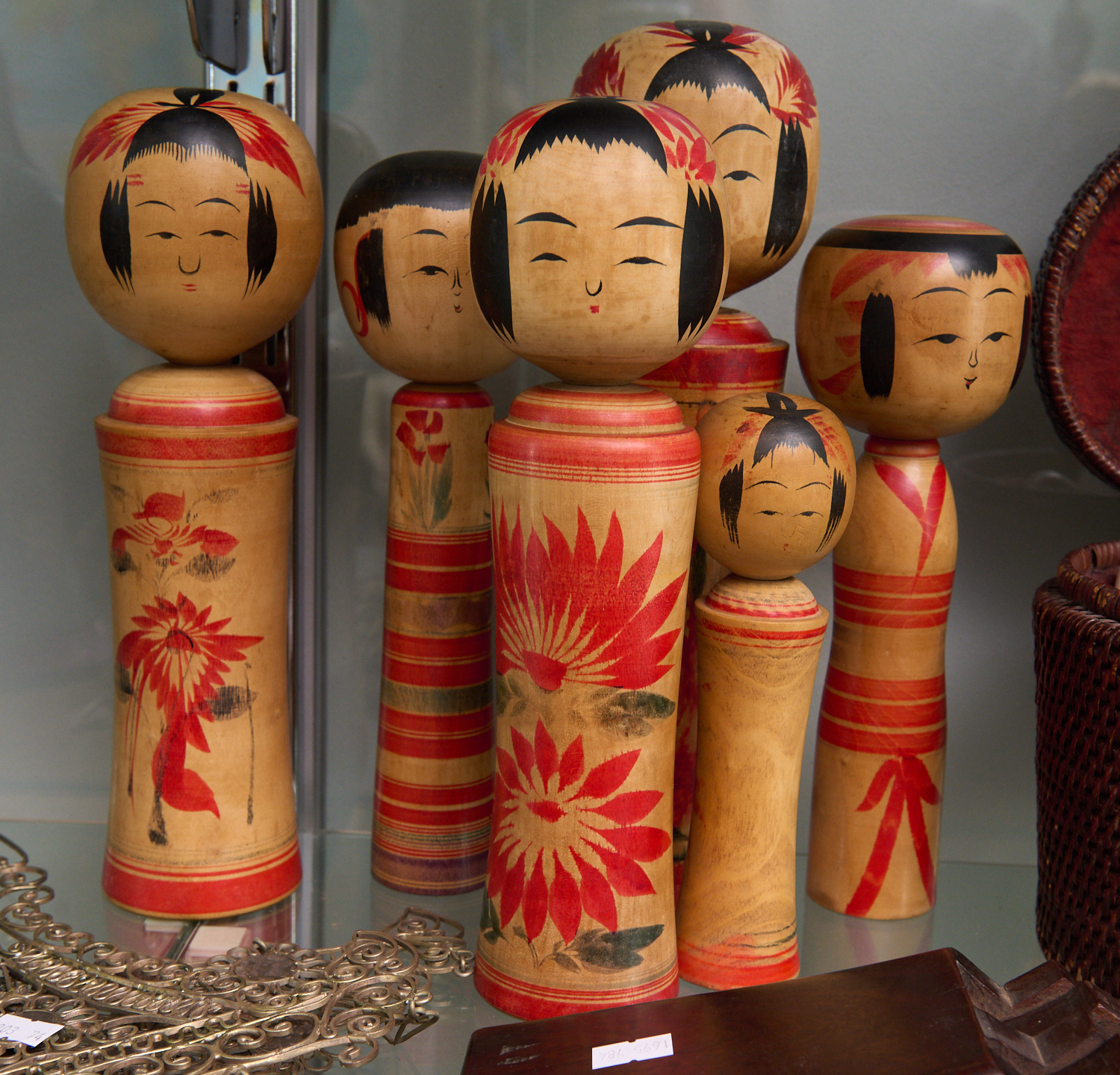 COLLECTION OF SIX VINTAGE HAND PAINTED WOODEN JAPANESE KOKESHI DOLLS, LEONARD JOEL LOCAL DELIVERY SIZE: SMALL
