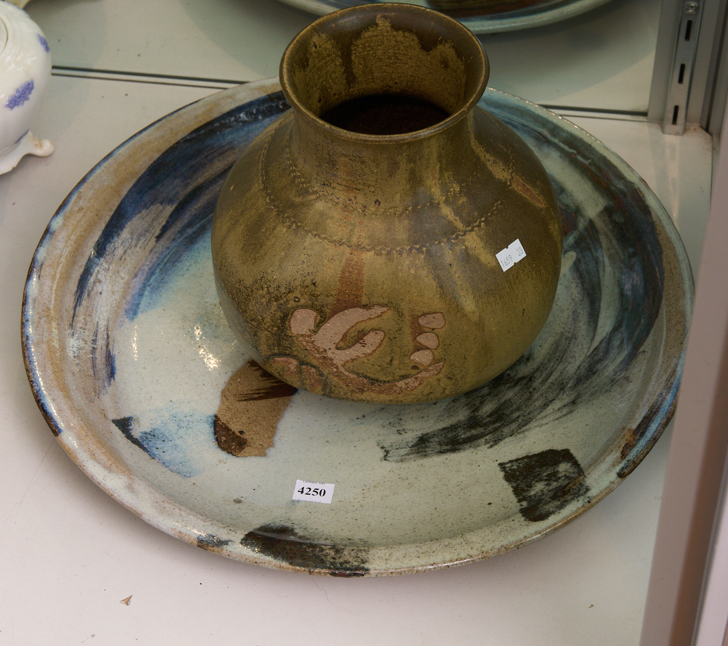 TWO PIECES OF 1970S AUSTRALIAN STONEWARE - PLATTER AND VASE - VASE SIGNED DENIS MCCONNELL '78 DIA.45CM, LEONARD JOEL LOCAL DELIVERY SIZE: SMALL