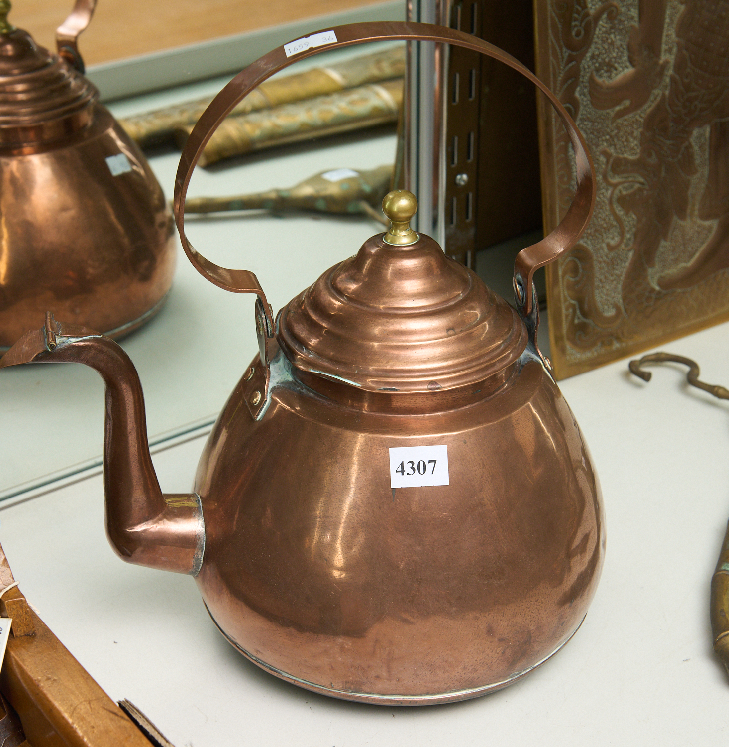 A FRENCH COPPER & BRASS KETTLE WITH FOLDING HANDLE (33 CM H), LEONARD JOEL LOCAL DELIVERY SIZE: SMALL