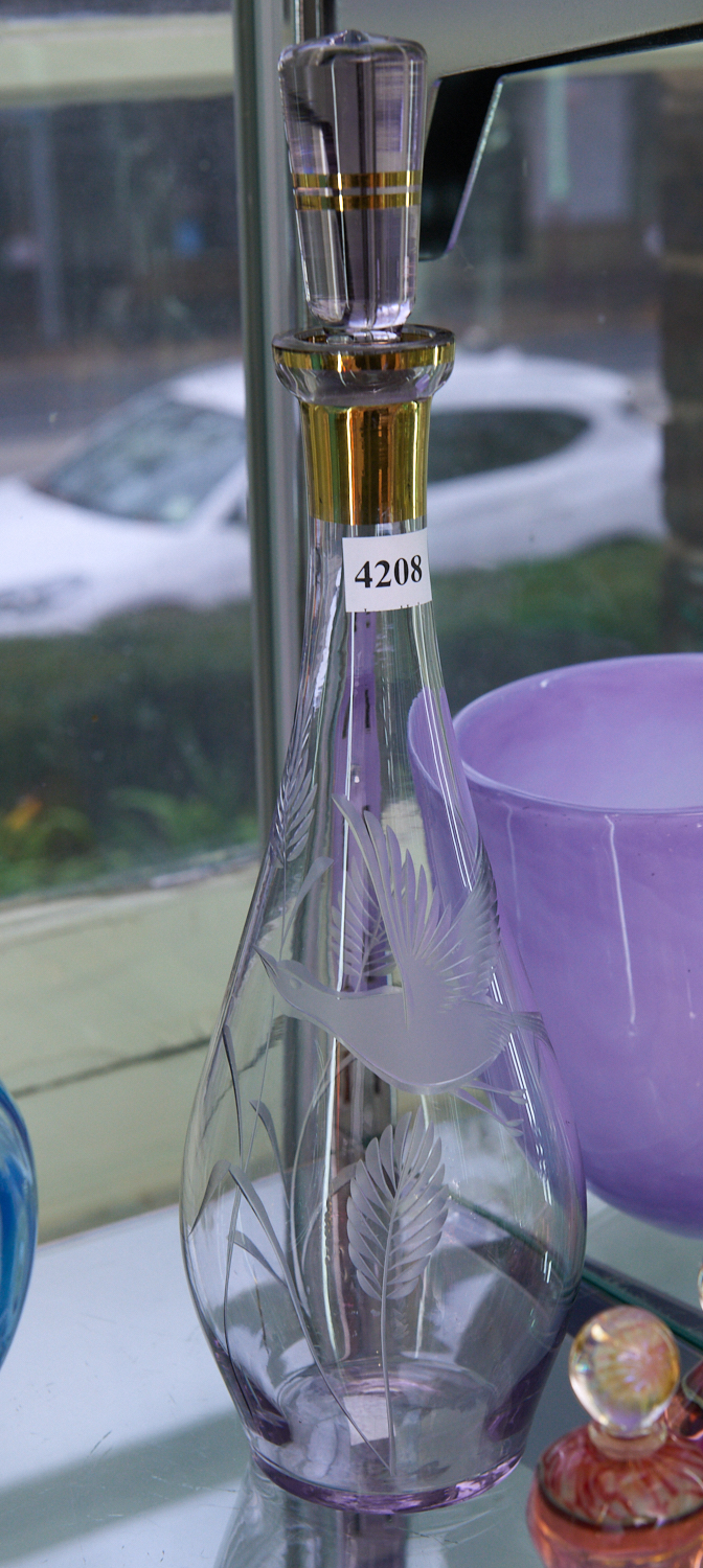 A PALE LILAC ENGRAVED DECANTER WITH GILT HIGHLIGHTS H.35CM, LEONARD JOEL LOCAL DELIVERY SIZE: SMALL