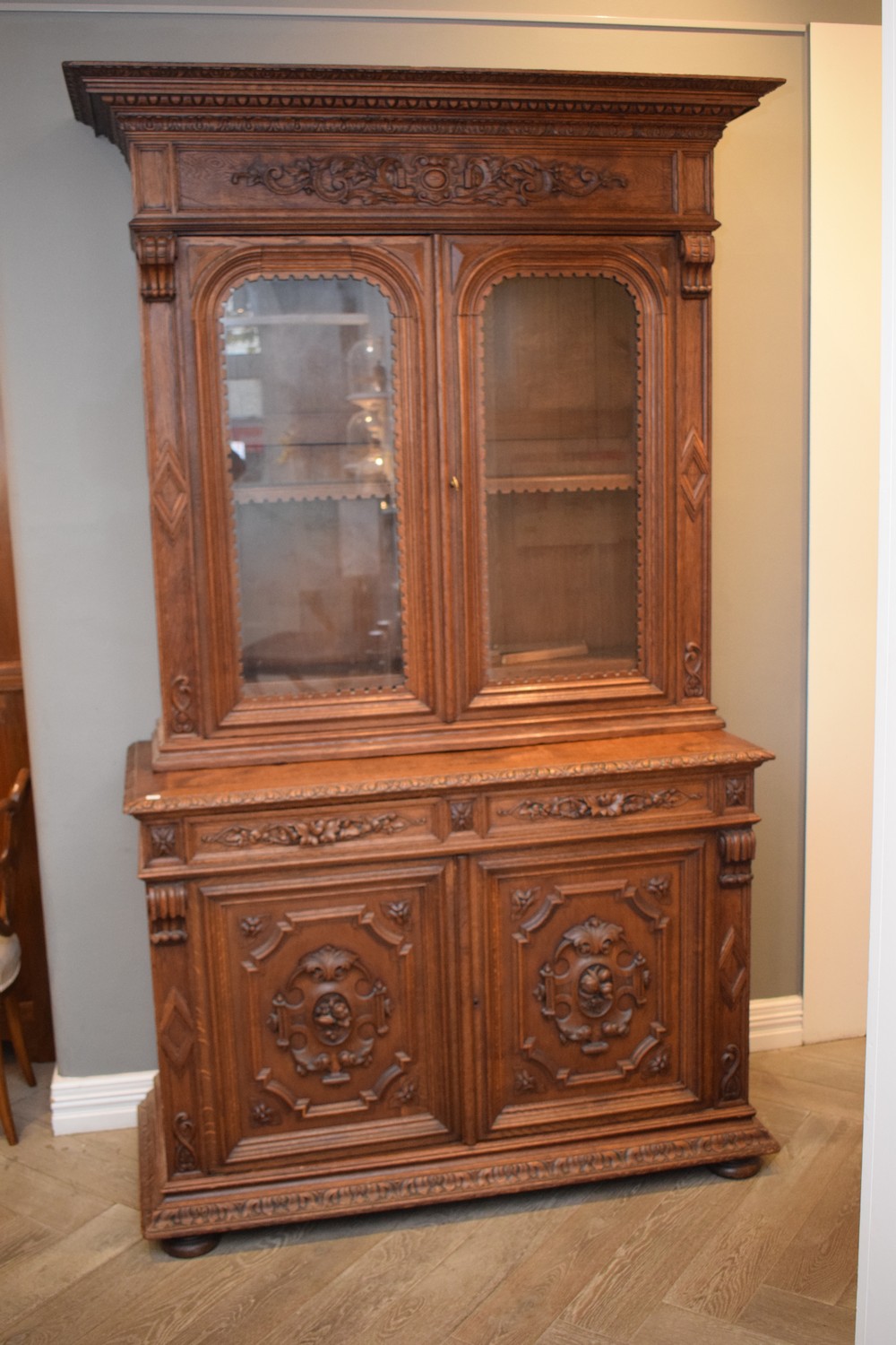 A SUBSTANTIAL OAK DECORATIVELY CARVED DOUBLE BODIED CABINET ( 244H X 140W X 61D CM) (PLEASE NOTE THIS HEAVY ITEM MUST BE REMOVED BY CARRIERS AT THE CUSTOMER'S EXPENSE. LEONARD JOEL STAFF CANNOT ASSIST CARRYING THIS ITEM) (X-LARGE ITEM)