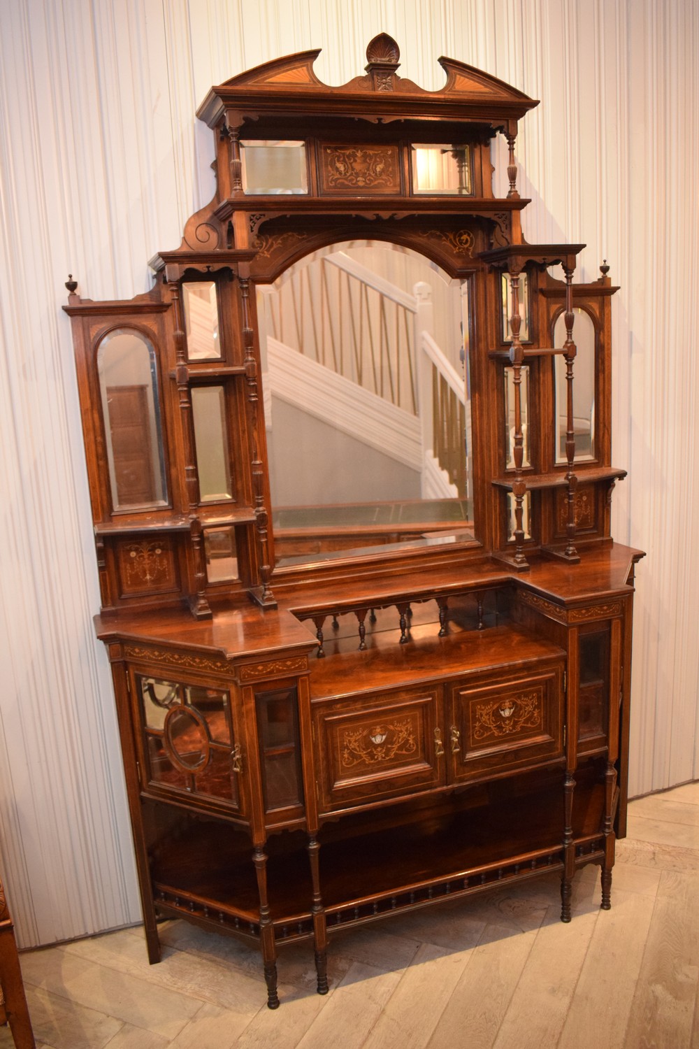 A DECORATIVELY CARVED VICTORIAN ROSEWOOD MIRRORBACK CABINET WITH INTRICATE INLAY DETAILING (250H X 170W X 50D CM) (PLEASE NOTE THIS HEAVY ITEM MUST BE REMOVED BY CARRIERS AT THE CUSTOMER'S EXPENSE. LEONARD JOEL STAFF CANNOT ASSIST CARRYING THIS ITEM) (X-LARGE ITEM)