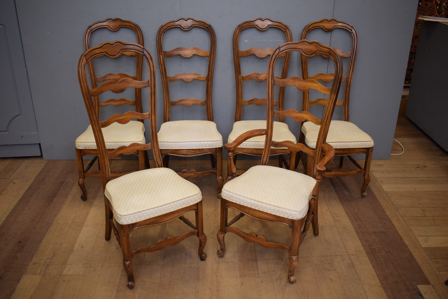 A SET OF SIX FRENCH PROVINICIAL STYLE LADDERBACK DINING CHAIRS (A/F) (115H x 54W x 48D CM) (LEONARD JOEL DELIVERY SIZE: LARGE)
