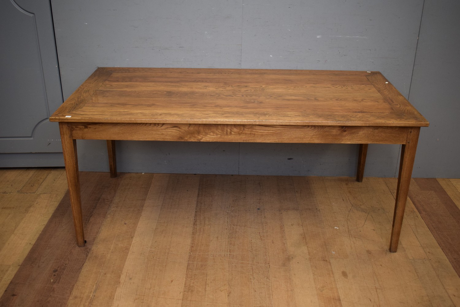 AN OAK FRENCH FARMHOUSE STYLE DINING TABLE WITH TAPERED LEGS (77H x 180W x 91D CM) (PLEASE NOTE THIS HEAVY ITEM MUST BE REMOVED BY CARRIERS AT THE CUSTOMER'S EXPENSE. LEONARD JOEL STAFF CANNOT ASSIST CARRYING THIS ITEM) (X-LARGE ITEM)